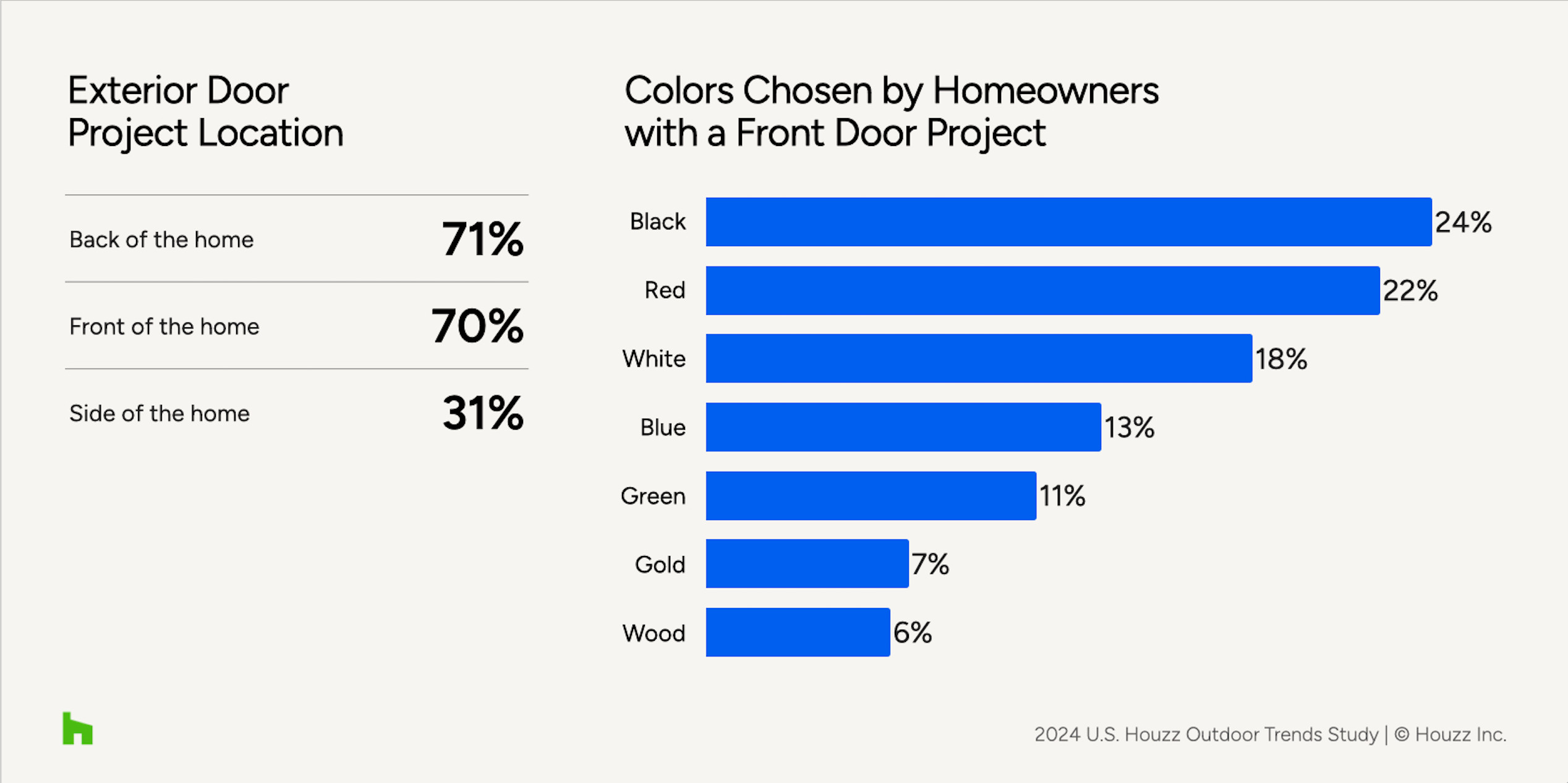 Renovating homeowners opted to make a statement with a wide range of colors for their front doors, led by black (24%) and red (22%). White (18%), blue (13%), green (11%) and gold (7%) were also popular. Along with front door improvements, 1 in 8 homeowners upgrading outdoor features added new house numbers (12%).