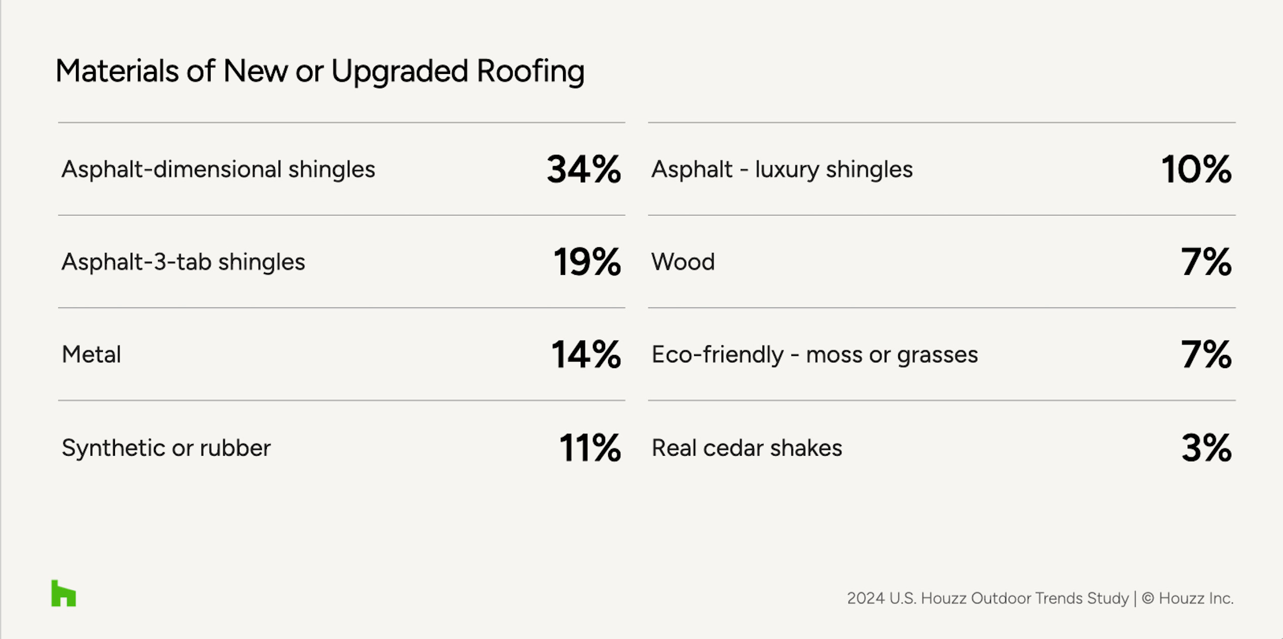 Among renovating homeowners with a roofing project, nearly two-thirds completely replaced their roof (64%). The most common materials included asphalt-dimensional shingles (34%) and asphalt-3-tab shingles (19%).