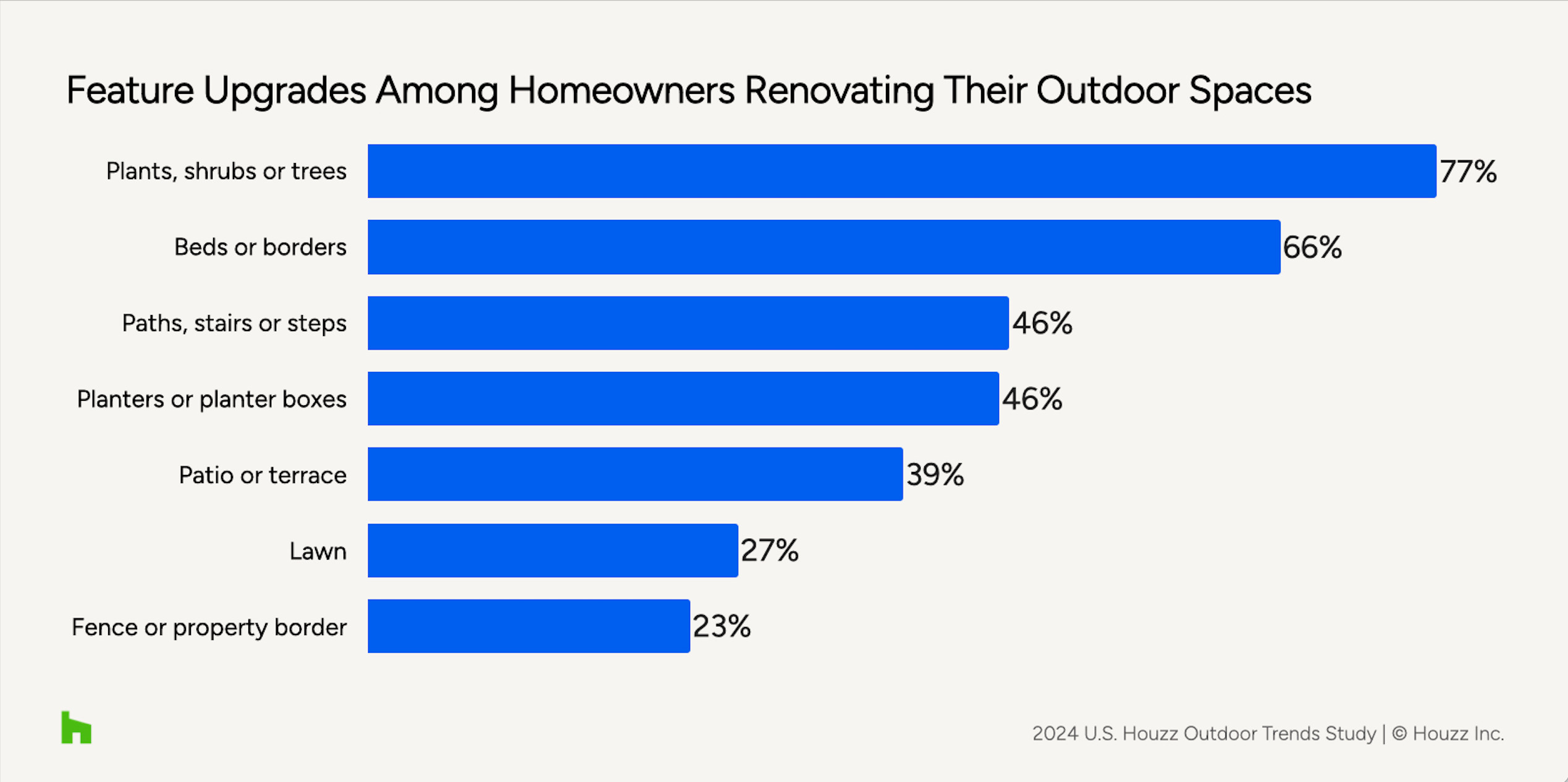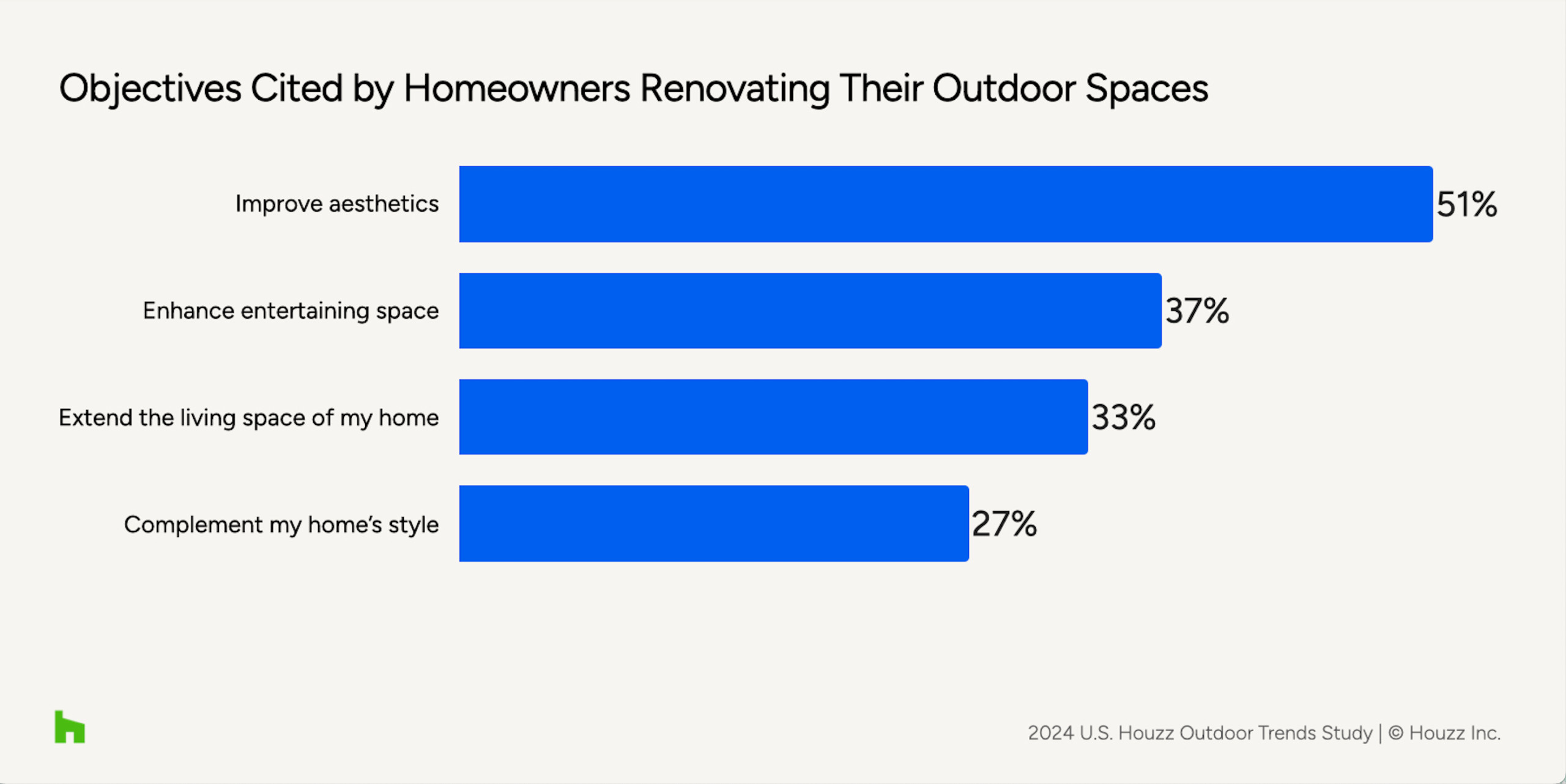 *The 2024 U.S. Houzz Outdoor Trends Study is a report of homeowners who are in the midst of, are planning or recently completed an outdoor renovation. The online survey was fielded to U.S. Houzz users in May 2024, and included 1,106 respondents.