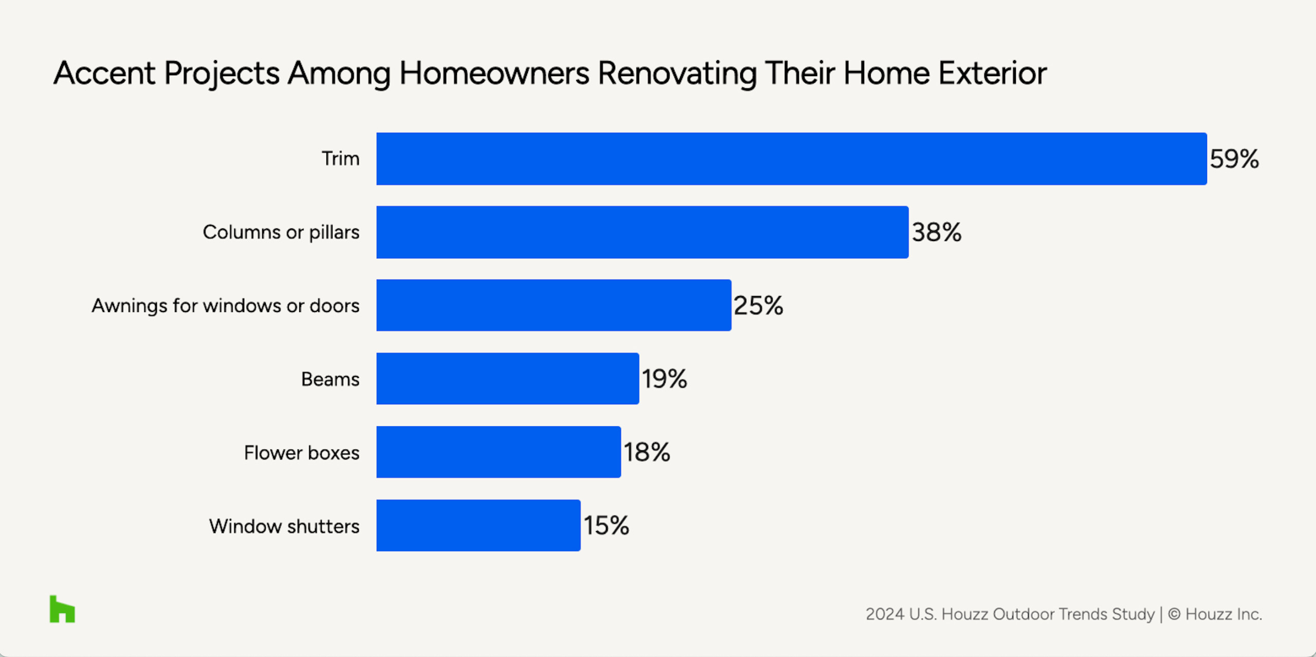 Of the homeowners who invested in exterior accents to enhance their curb appeal (31%), trimwork was the leading focus (59%), followed by columns or pillars (38%), awnings (25%), beams (19%), window flower boxes (18%) and shutters (15%).