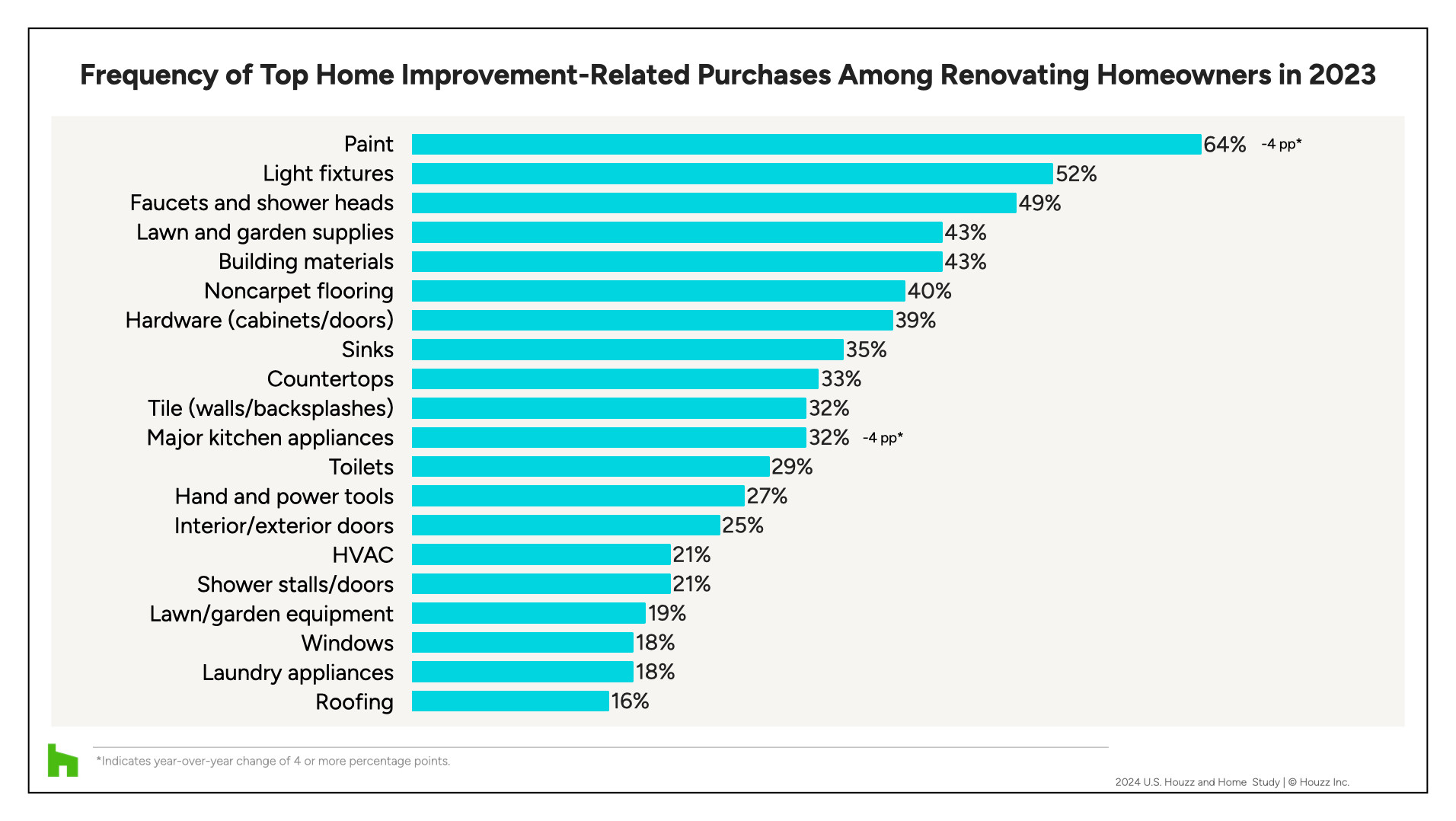 Homeowners buy a variety of products when remodeling their home. Paint is the most popular, though the share of homeowners buying paint decreased from 68% in 2022 to 64% in 2023. Light fixtures also are popular (52%), followed closely by faucets and shower heads (49%). Major kitchen appliances dropped by 4 percentage points, to 32%, in 2023.