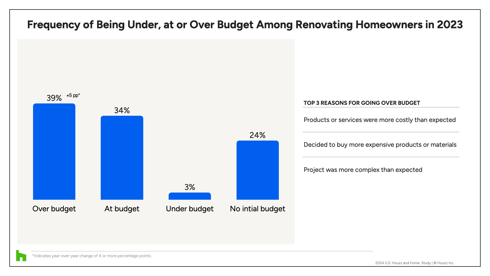 The main reasons homeowners go over budget include unforeseen costs for products and services, increased project complexity, and choosing more expensive products and materials. But it’s worth pointing out that more than a third of homeowners (34%) managed to stay on budget, and a few (3%) even came in under budget.