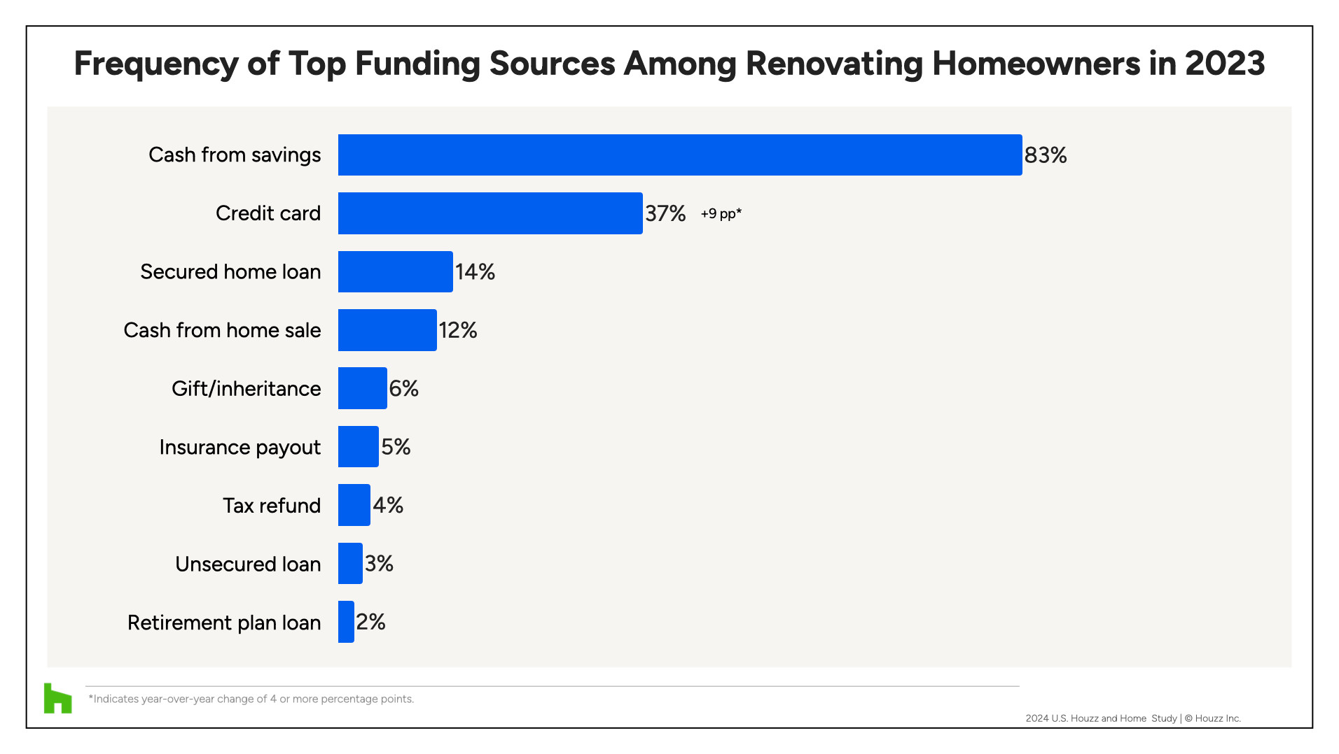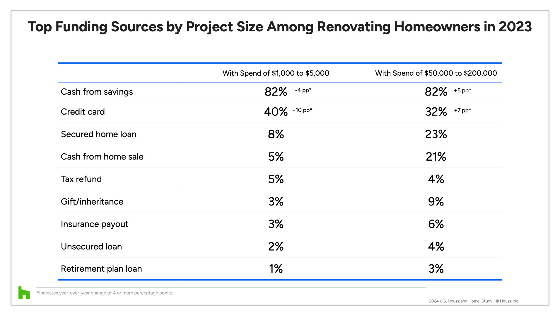 Looking at a breakdown of funding by budget size, the share of homeowners using credit cards for lower-budget projects (from $1,000 to $5,000) increased by 10 percentage points. The share of homeowners using credit cards for higher-budget projects (from $50,000 to $200,000) rose by 7 percentage points.