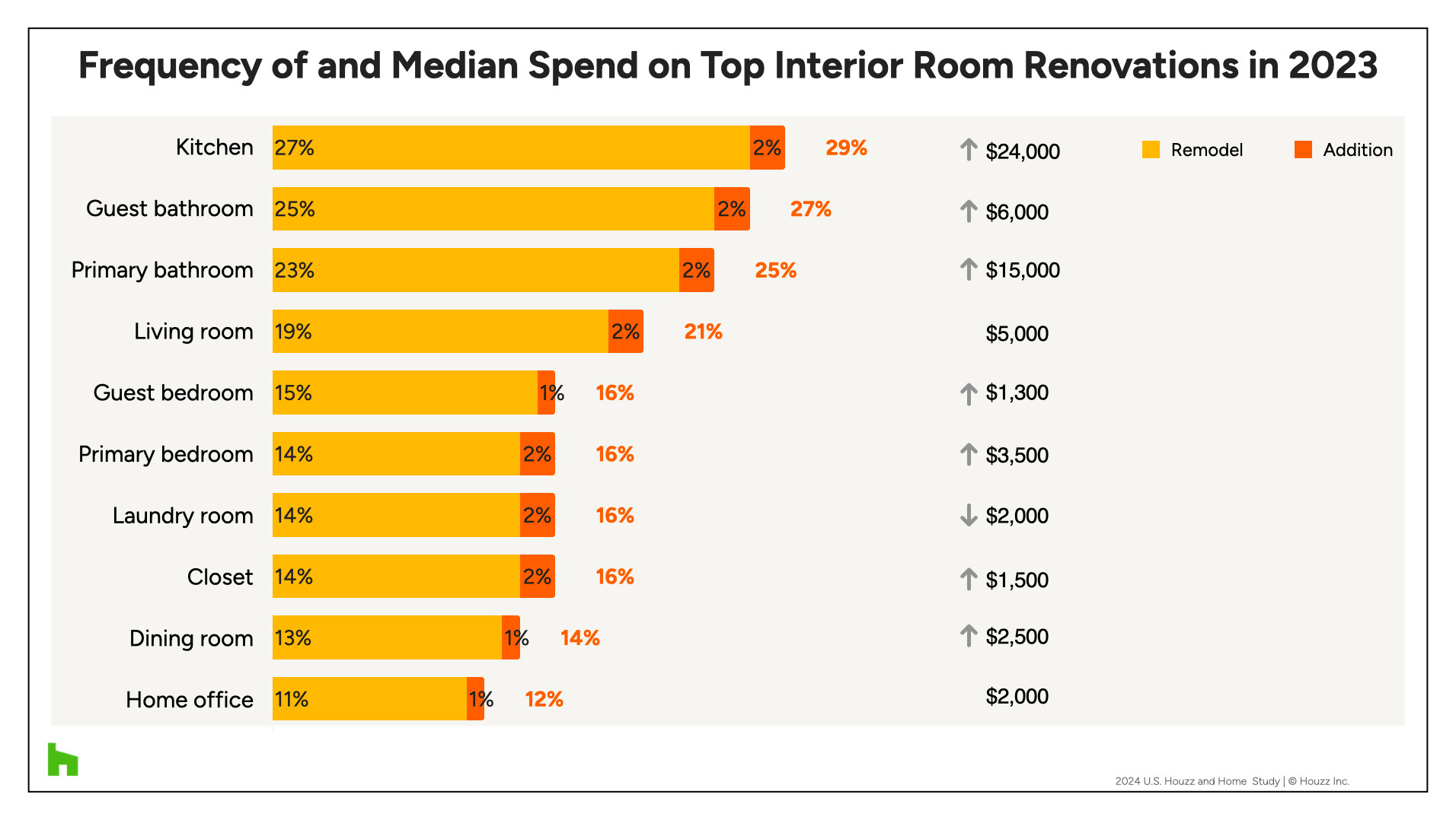 The kitchen often is considered the hub of the home, so perhaps it’s not surprising that it’s the most commonly remodeled room in the home (27%). Guest bathrooms (25%) and primary bathrooms (23%) follow closely. About a fifth of homeowners (19%) remodeled their living room in 2023. The red areas in the bar chart here show that a small percentage of homeowners (1% to 2%) created additions for various rooms.