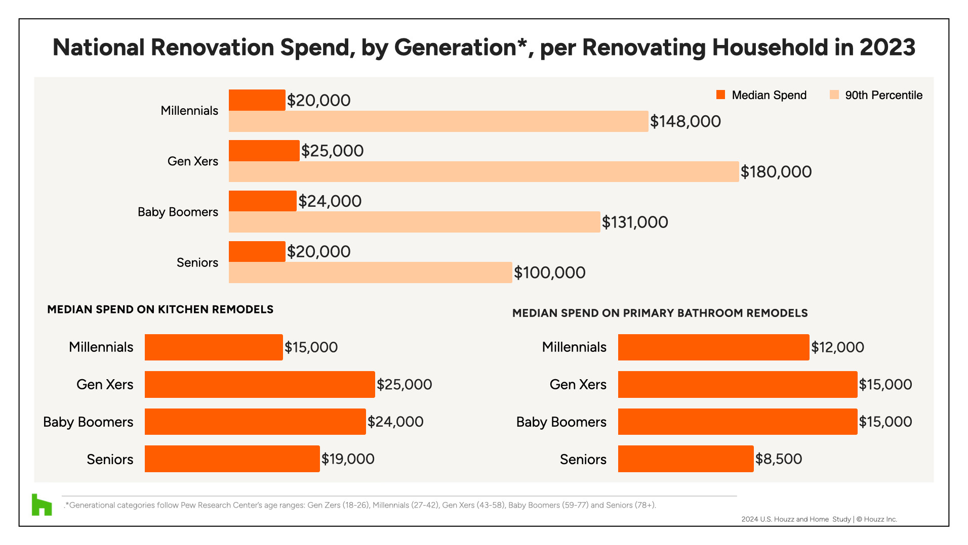 A generational breakdown reveals interesting patterns in renovation spending. For example, Gen Xers have the highest median renovation spend, $25,000, for 2023. Baby Boomers follow closely behind, at $24,000.