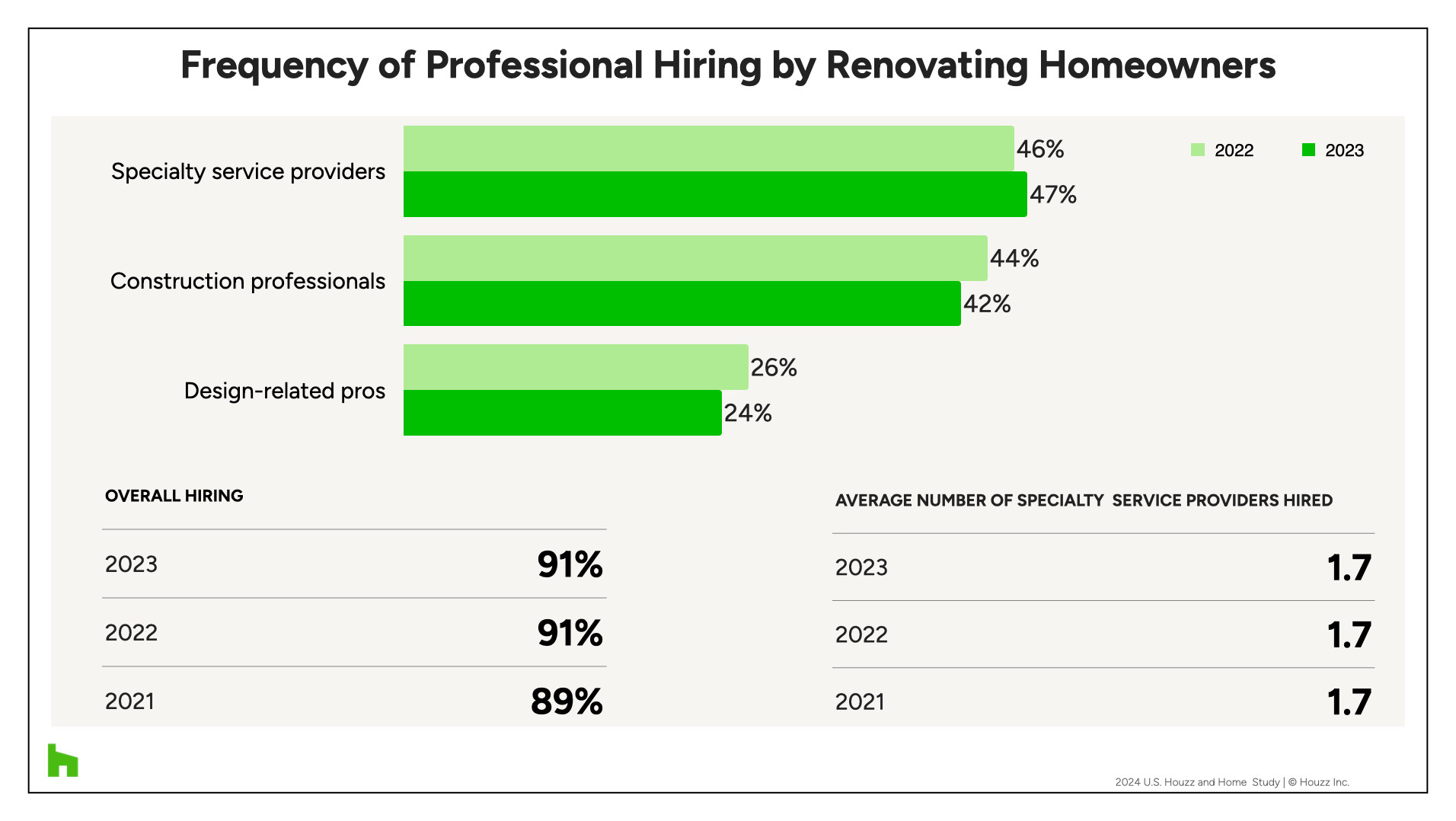 Consistent with previous years, the vast majority of homeowners (91%) hired pros to help with their remodeling projects in 2023. The share of homeowners hiring specialty service providers increased slightly, rising from 46% in 2022 to 47% in 2023.