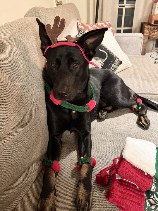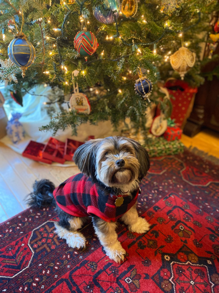 Houzz editor Suzanne Ennis’ dog Beatrix shows off her seasonal style by color-coordinating with the holiday decor.