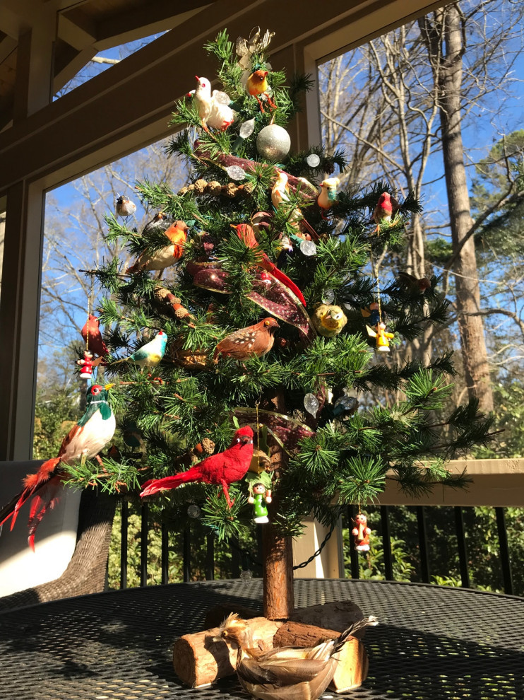 The tree you share needn’t be full-size. For example, a new addition to a home inspired this sweet bird-themed tabletop tree. “Our screen porch was finished in 2023, so we were able to put up our little tree for the birds at the outside feeder to enjoy,” Houzz user hunnicook wrote last year. “The tree is decorated with vintage feather birds.”
