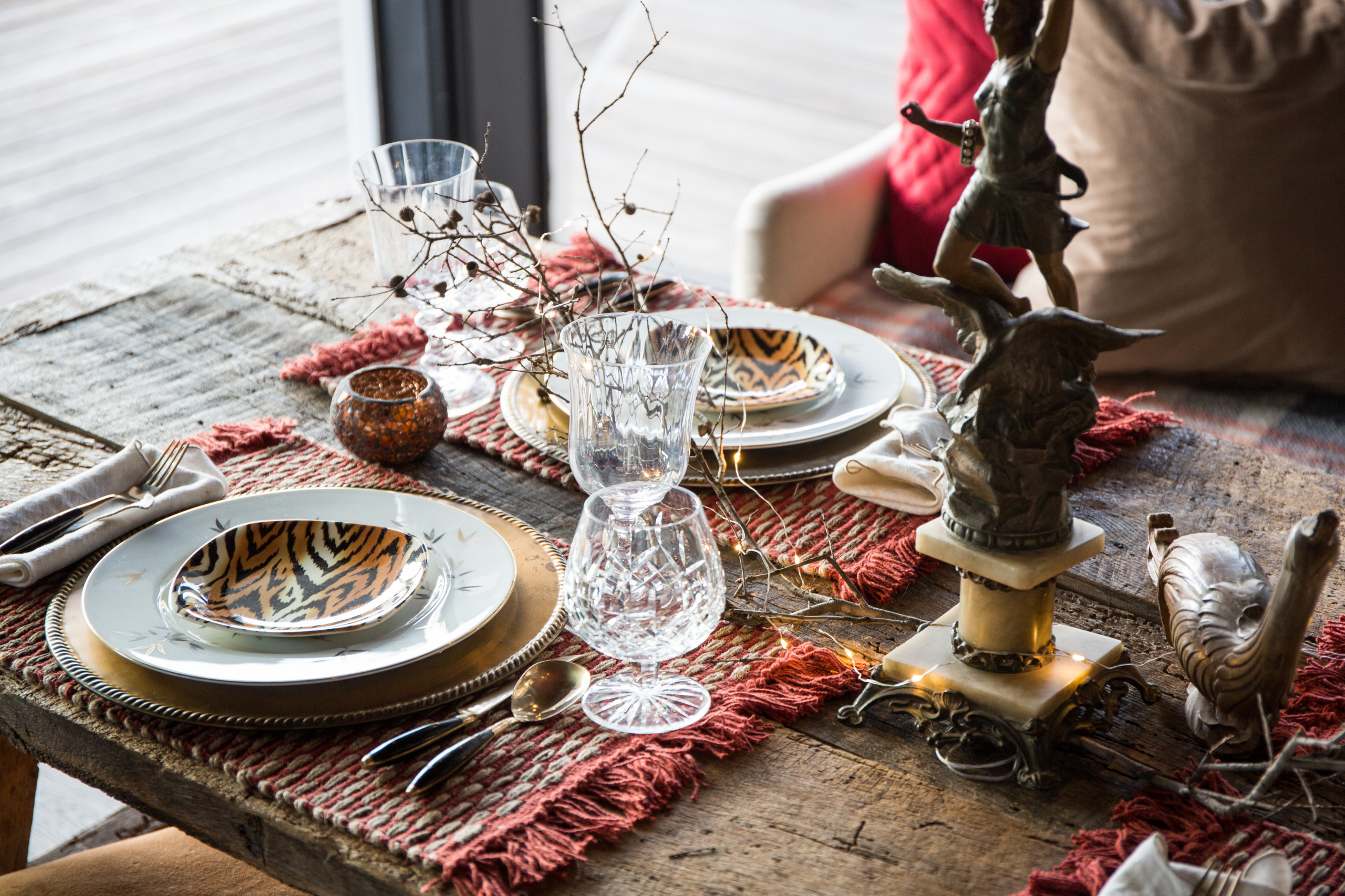 For the tablescape, Ggem mixed rustic and refined. The rustic part includes the primitive table, the woven place mats and branches she gathered from her yard. Then she layered a mix of fine china, crystal and silverware, along with statues, candles and tiny lights.
