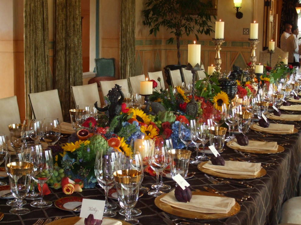 What kind of color scheme do you use for your table? Interior designer Leanne Michael incorporated lots of bright color on this table in Montecito, California, through the centerpiece. “We used exquisite fresh florals and cut fruits and vegetables in the centerpiece, along with using baby artichokes for hand script place card holders,” she wrote.