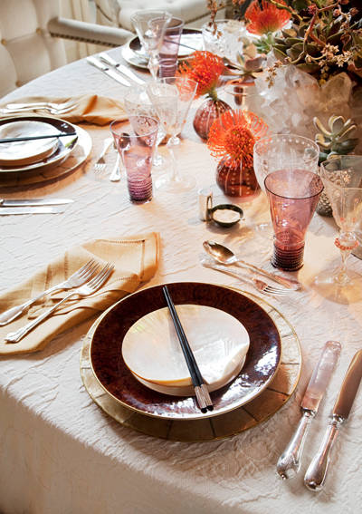 Protea pin cushion flowers in tiny vases decorate each place setting, and succulents bring their sculptural shapes to the centerpiece.