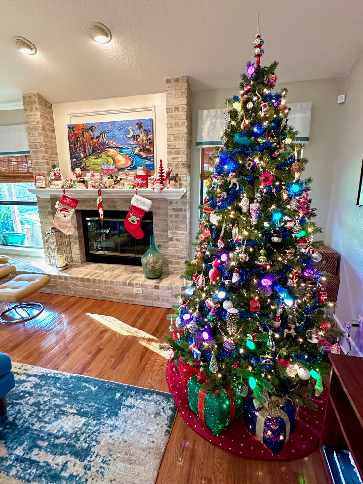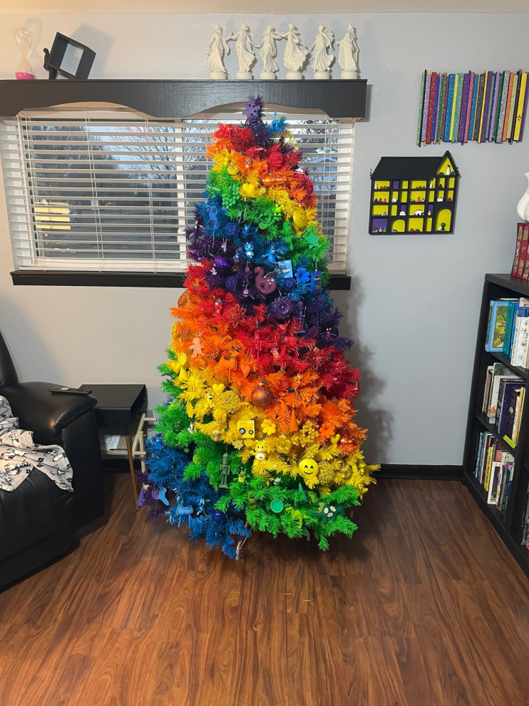Houzz user Lisa Starr has about 15 trees to choose from each year. This year she fashioned a steampunk-themed tree in the library and this rainbow tree in her living room.