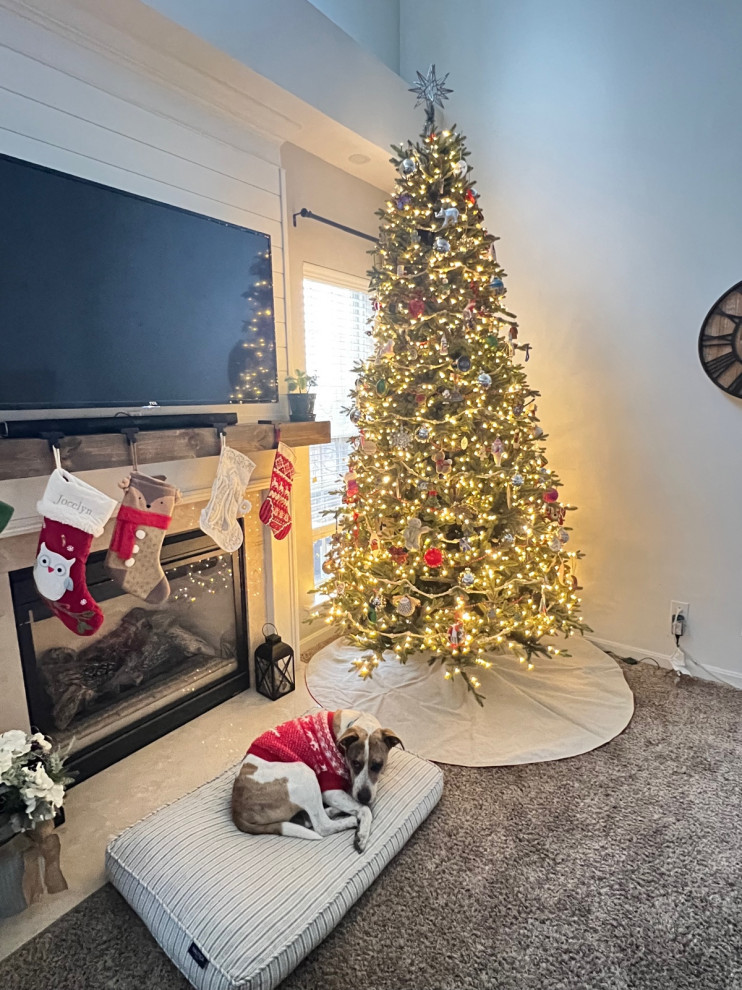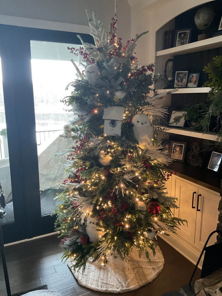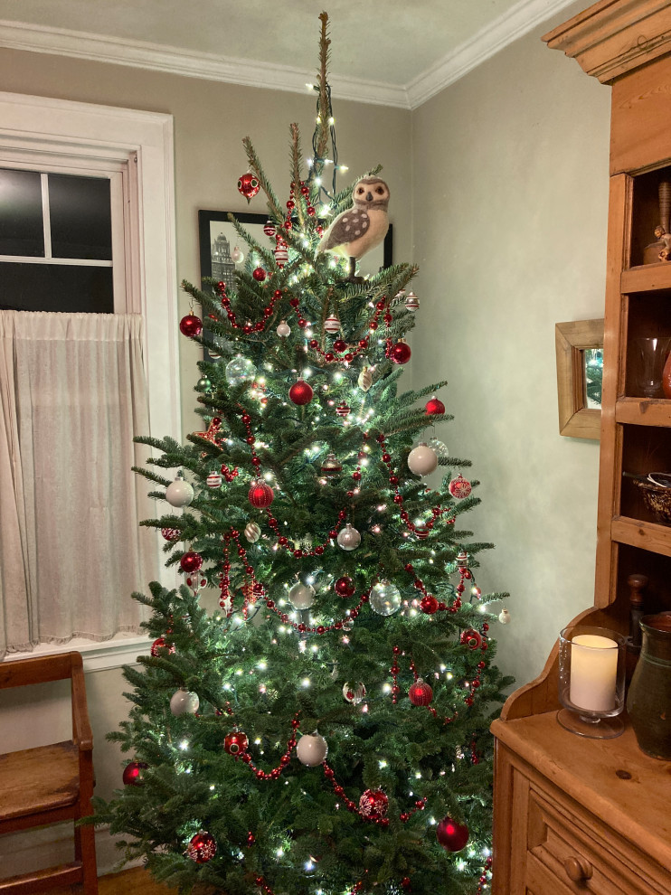 Many readers mentioned that their furry family members influenced their trees this year. “We have a rather young dog this year, so we have opted for a more narrow tree than usual, decorated with twinkle lights, classic red metallic garland and simple red- and white-toned ornaments,” Houzz user chekrei wrote. “An owl is perched near the top, keeping an eye on the dog!”