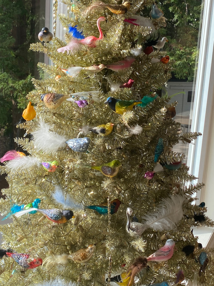 This gold tinsel tree is decorated with blown glass bird ornaments collected through the years. “I love the way the gold tree plays off the colorful sparkly ornaments,” Houzz reader specialslacks wrote.