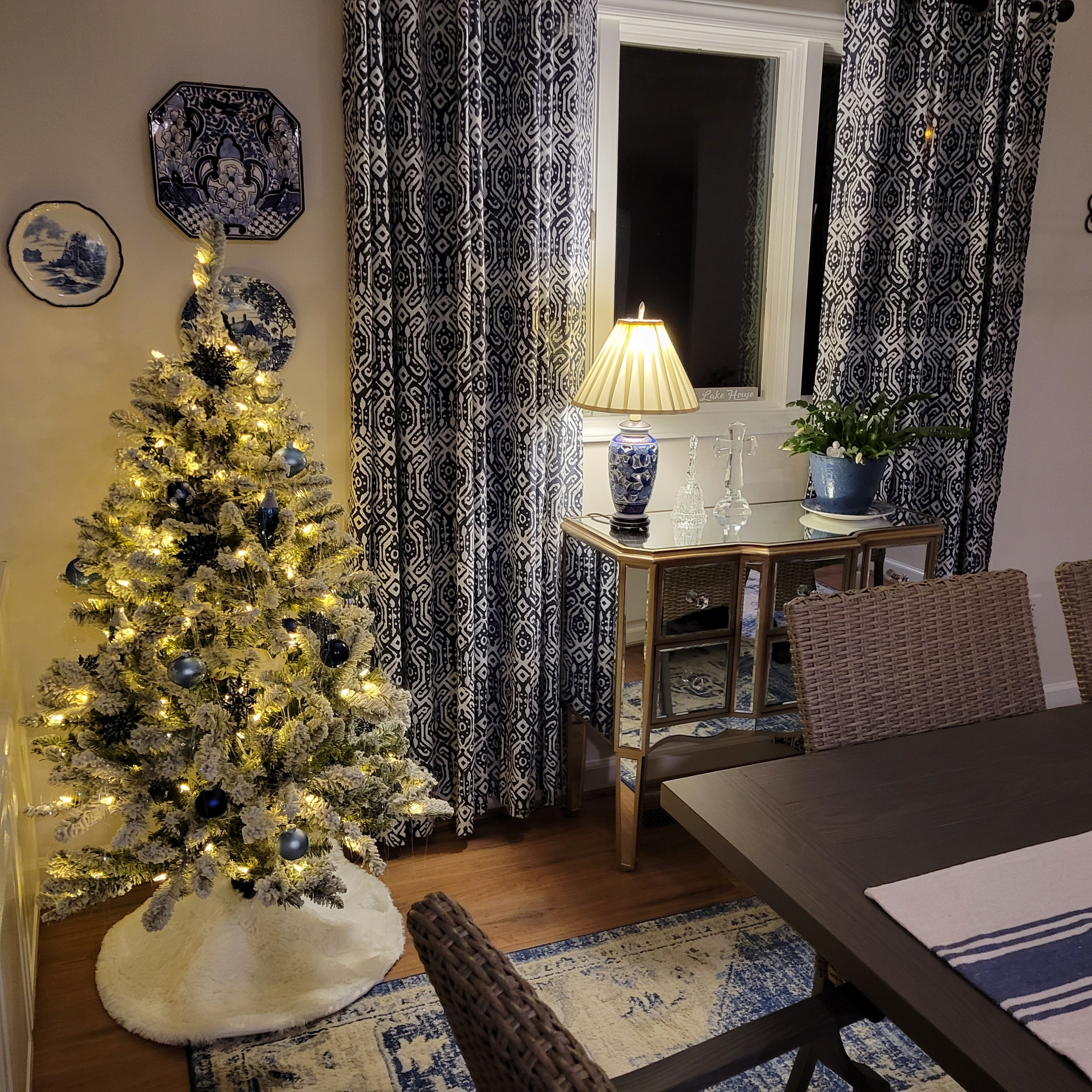 Many people go with a color theme. Houzz user Kathleen Rose matched this tree to her dining room’s lovely blue-and-white palette.