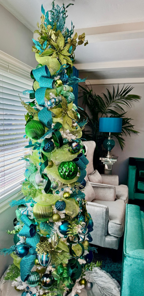 Other people like to use different color schemes on various trees throughout their homes. “I love any Christmas tree — they are all beautiful in their own way — and you can’t go wrong with traditional or nostalgic decorations,” Destry Lievanos wrote. “I do have one of those in my bedroom, but I also love color themed trees that match the rooms they are in.” This teal and green tree is a good match for the blue glass in the living room lamp.
