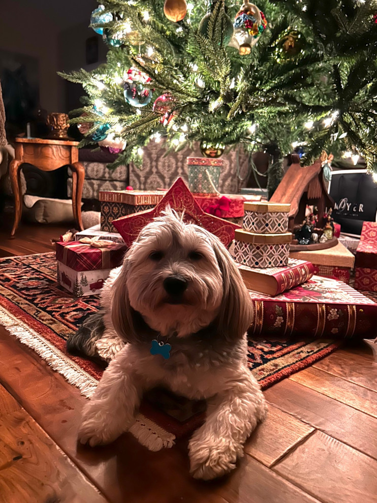 … and the dog, looking so happy! Modlodgeluv pays careful attention to the base of the tree, using beautifully embellished ornament storage boxes to look like presents are there for the whole season. There’s even a German nativity set placed atop one of them.
