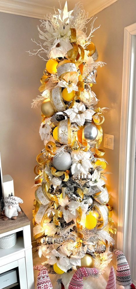 The tree in Destry Lievanos’ TV room has a completely different color palette. This one infuses silver, gold and white into the room’s gray-and-yellow color palette.