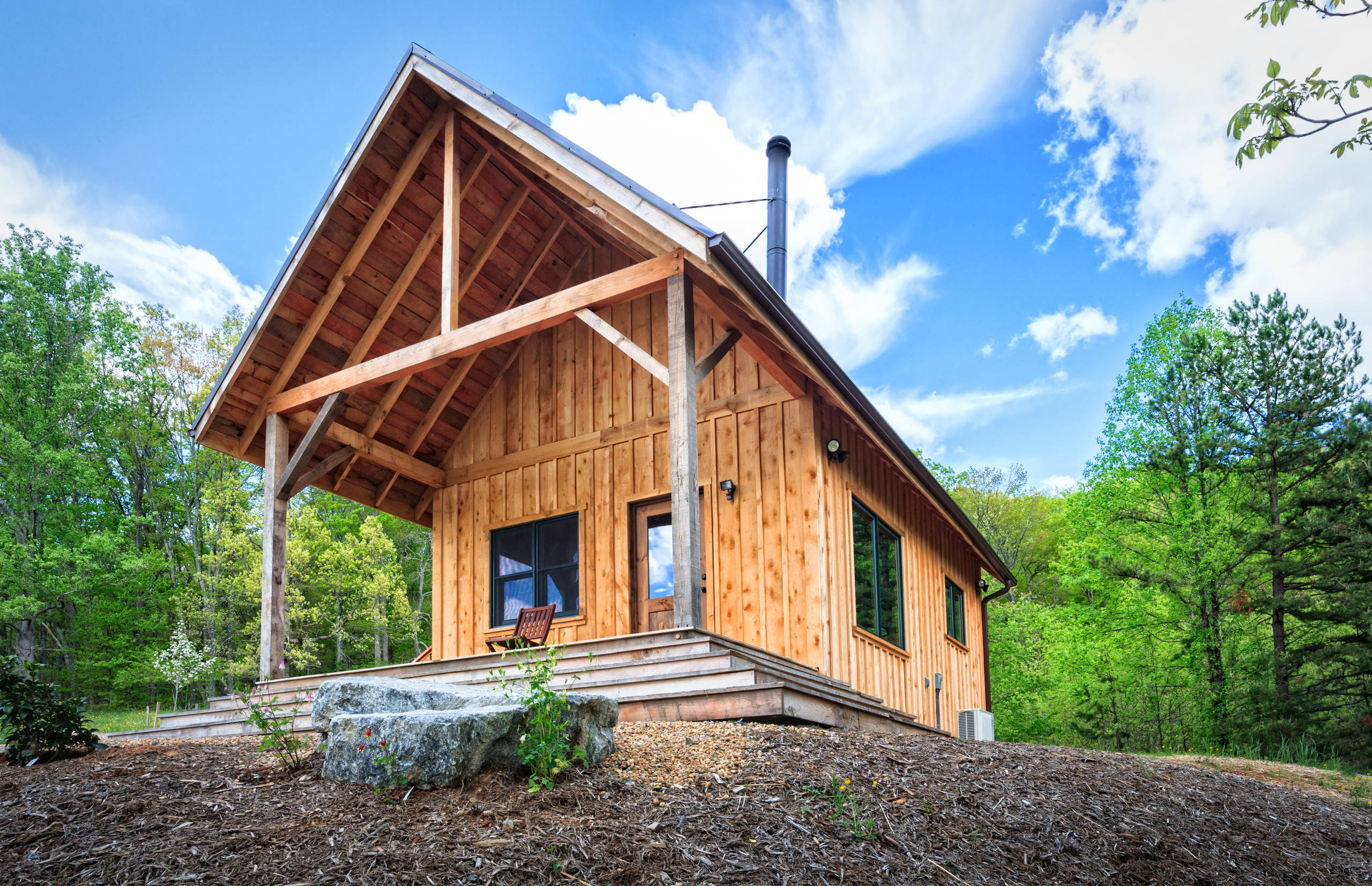 The exterior is board and batten rough-sawn hemlock. The front porch and rafters are locust, a naturally weatherproof hardwood that can last 50 years without treatment.