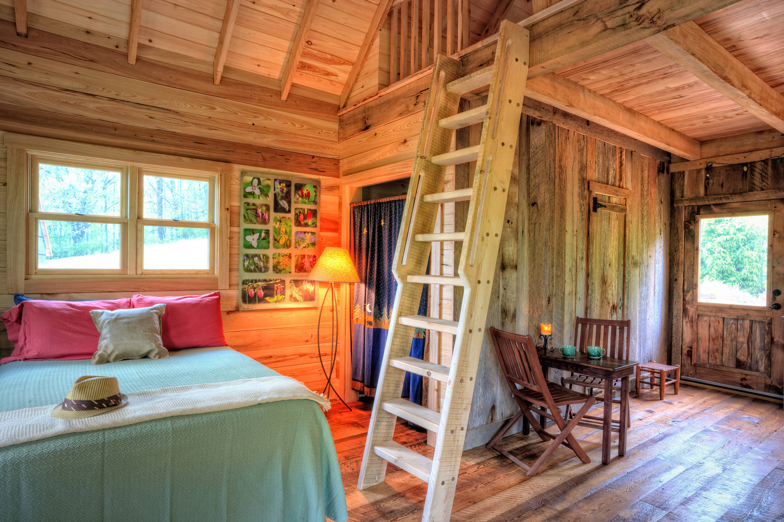 “Everyone comes into this cabin and their jaw drops,” Britten says. It is one open space, with a separate bathroom. The floors are reclaimed heart pine with three coats of Vermont PolyWhey, a finish made from cow’s milk.