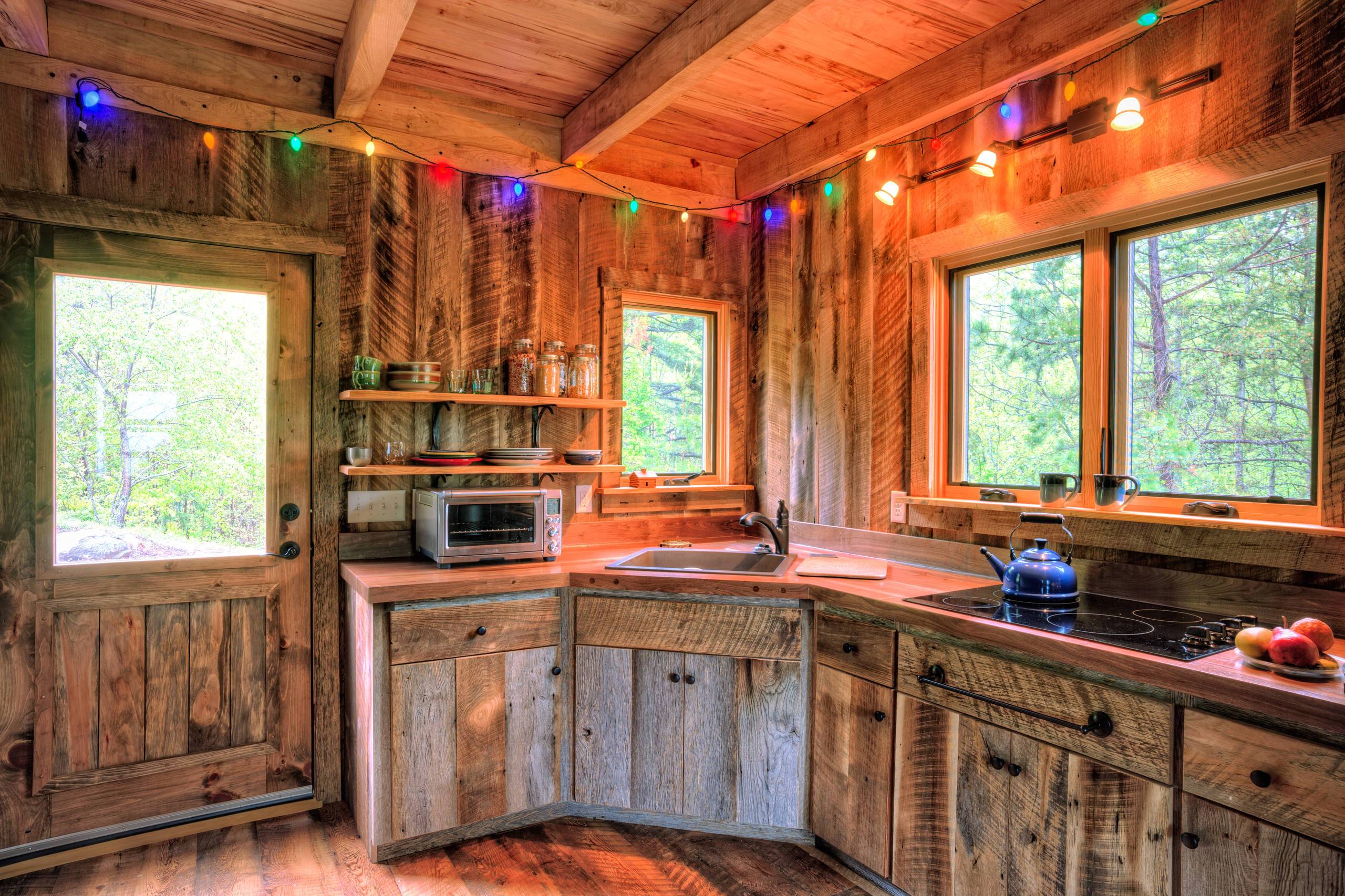 River Birch Builders built the kitchen cabinets onsite out of leftover reclaimed oak wall boards for $1,600. The countertop is black walnut, hand crafted for $1,000 by the same craftsman who made the door above. The ceiling is the floor to the loft above, and is wormy maple.