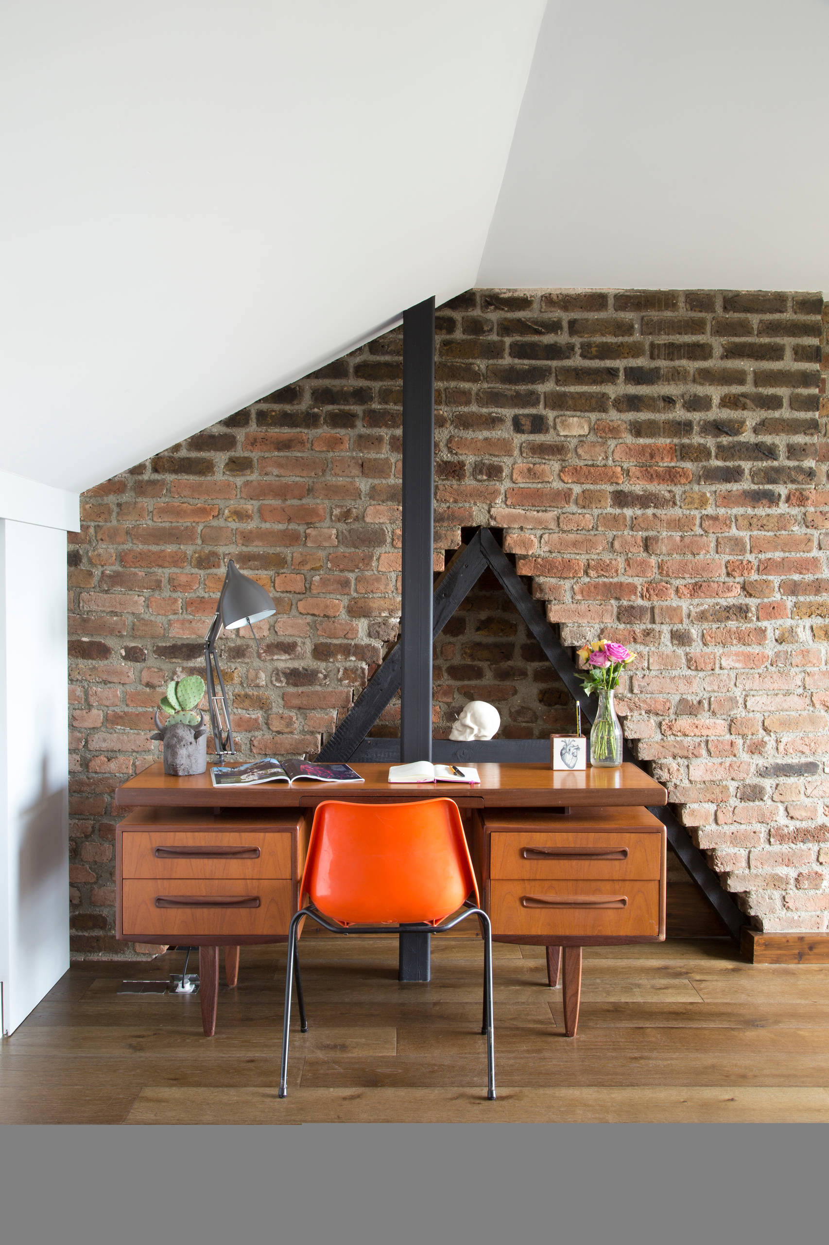 Mel’s office space is at the other end of the room. “We kept the RSJ on show and left the brick wall exposed,” Mel says.