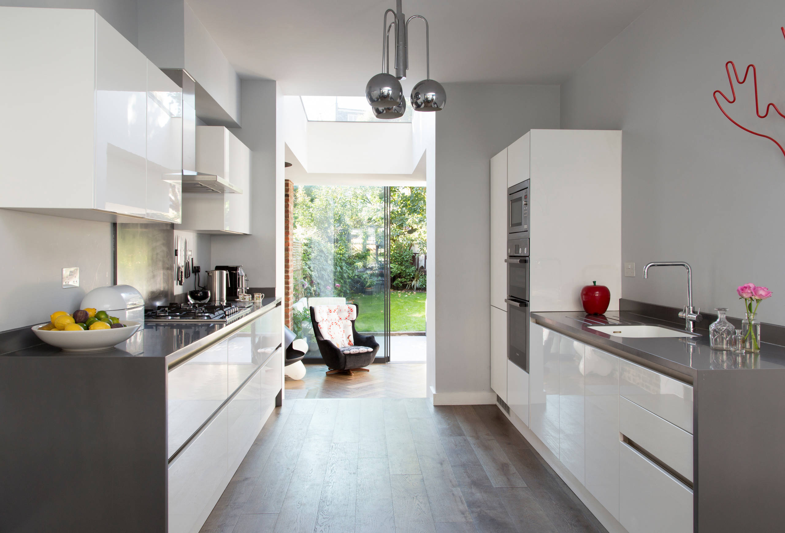 The galley kitchen has a streamlined design, with gloss fronts that reflect the light. Large pan drawers and roomy cupboards keep the worktops clear of clutter.