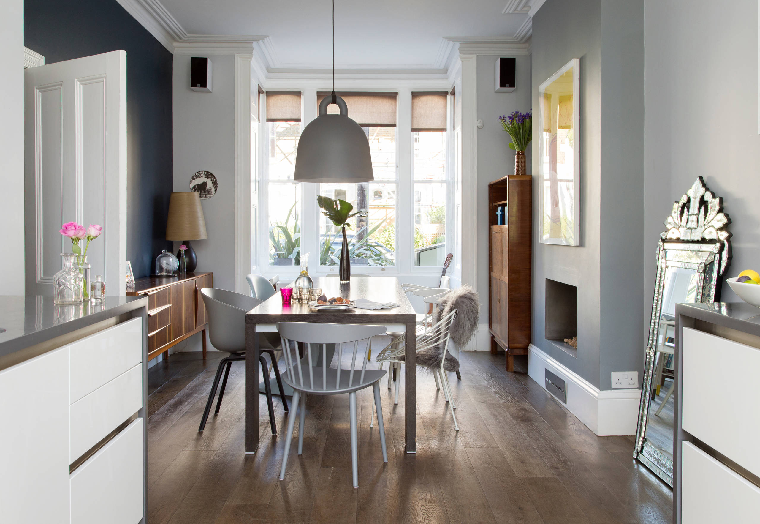 The deep blue dining room wall complements the vintage wooden sideboard and walnut alcove unit, which were both found on eBay.