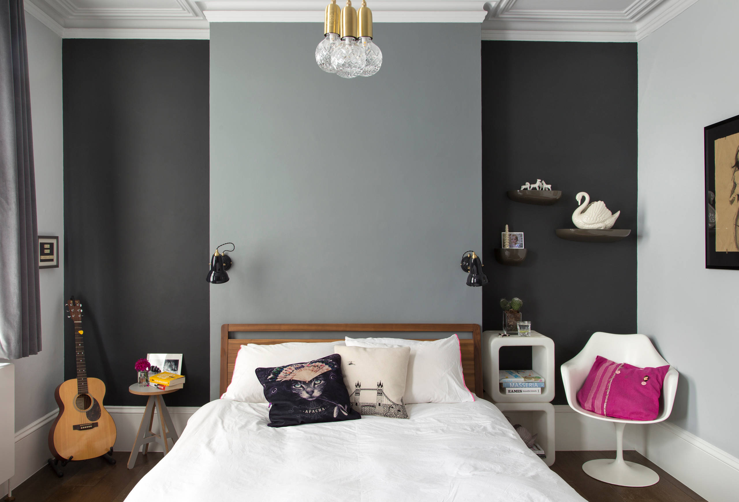 Pendant light, Lee Broom. Wall lights, Anglepoise. Walls painted in Lamp Black and Urbane Grey, both Little Greene. Bed, Habitat.