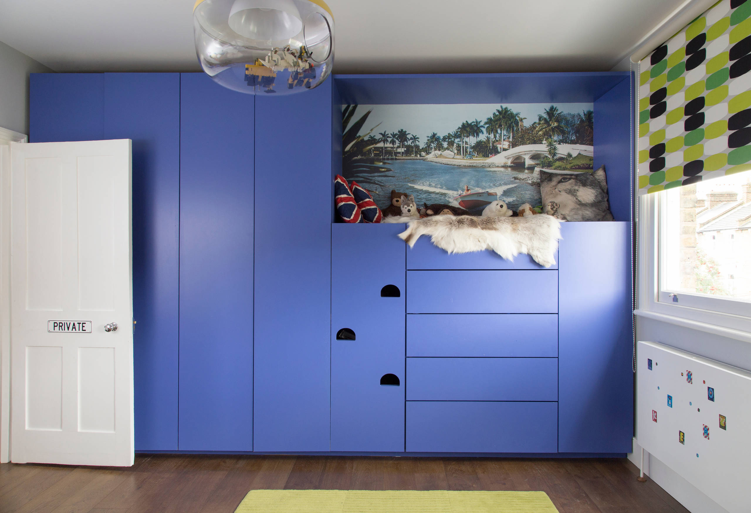 Bespoke wall-to-wall cupboards offer plenty of storage for both boys. “We created a fun hidey-hole for him with foot holes to climb up,” Mel says. “We’ll put the doors back on later when he’s too big to sit in it.”