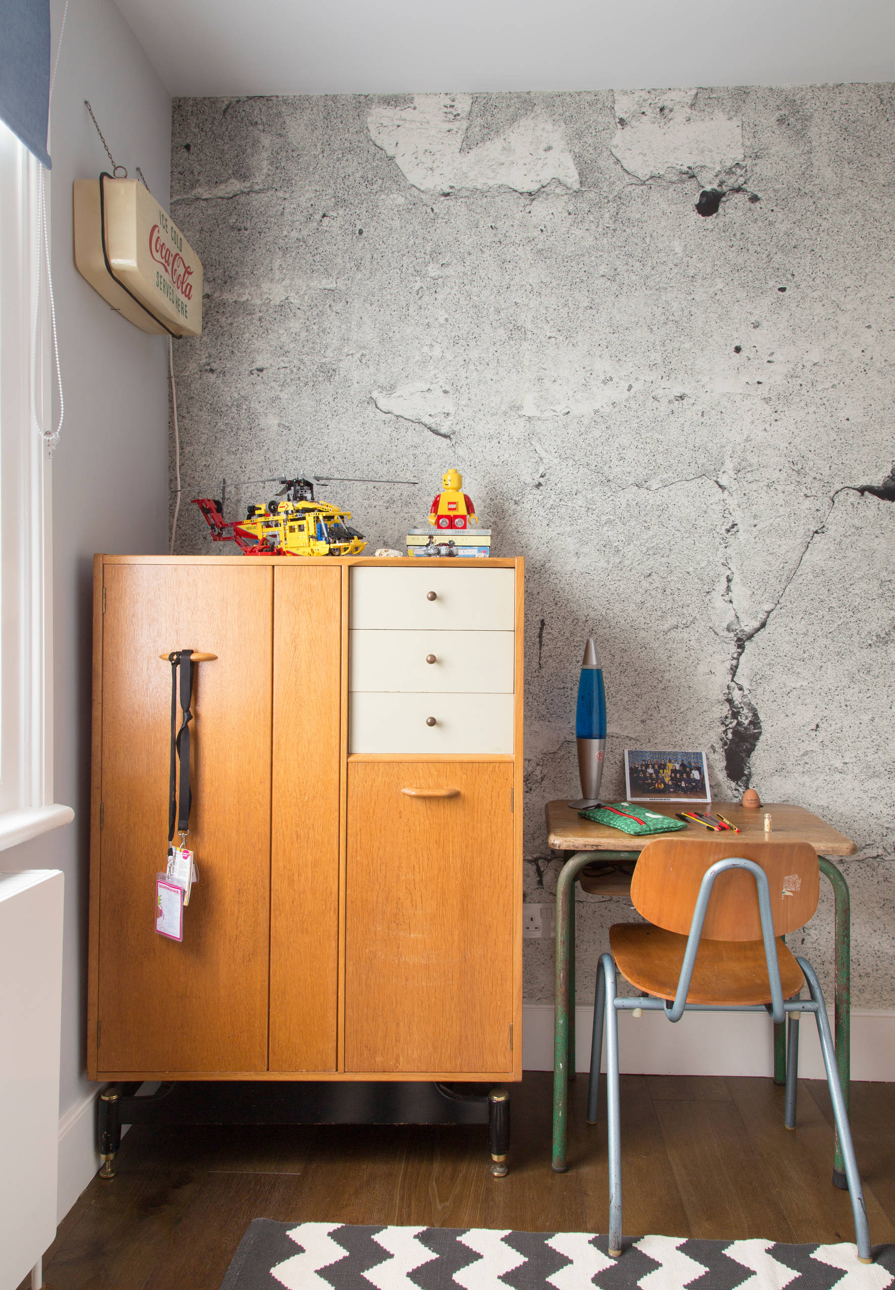 Opposite the bed, a vintage gentleman’s wardrobe and desk sit below a secondhand Coca-Cola light. “I like to use vintage items as much as possible around the house, as they look lovely and are less wasteful,” Mel says.