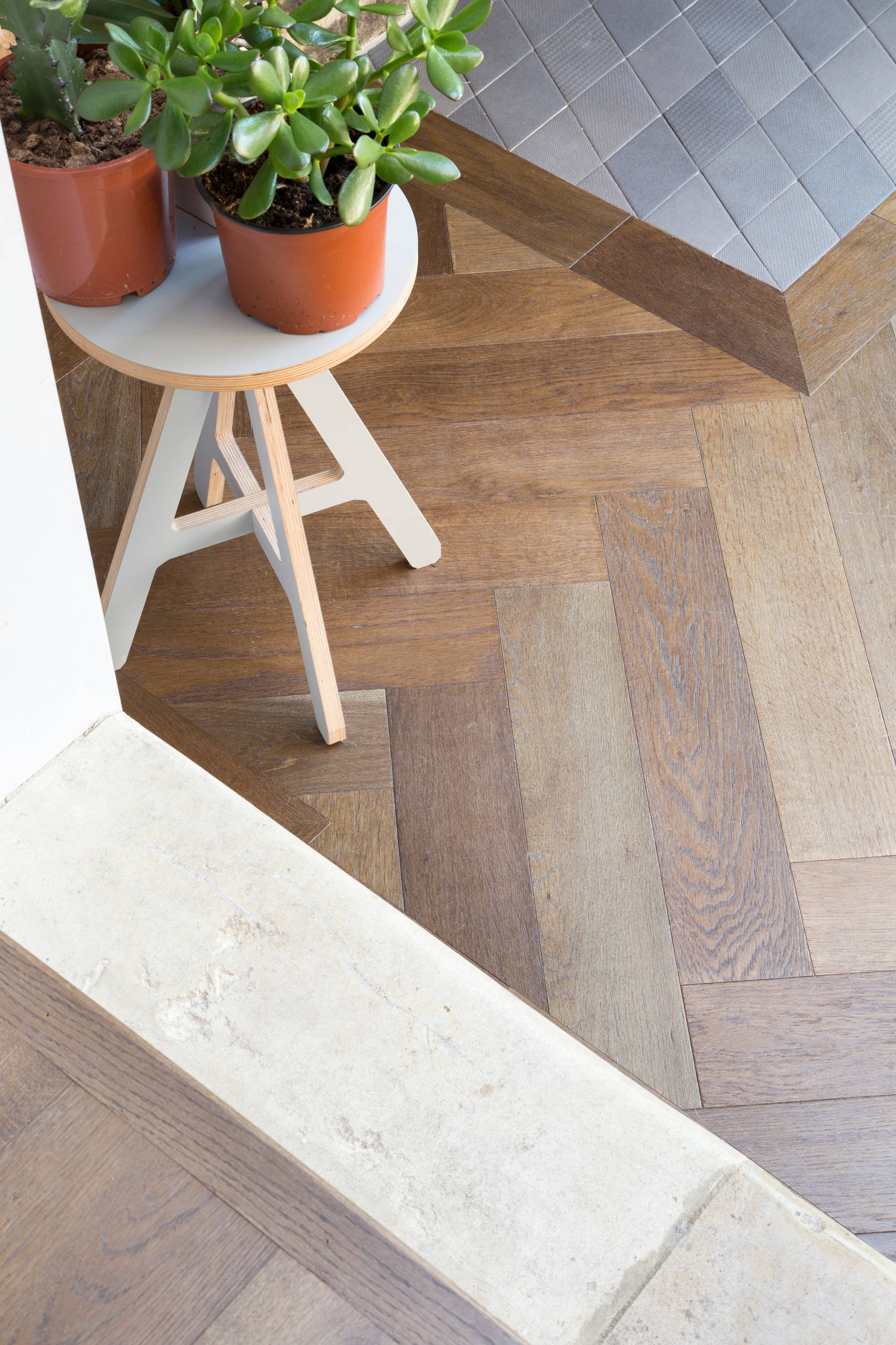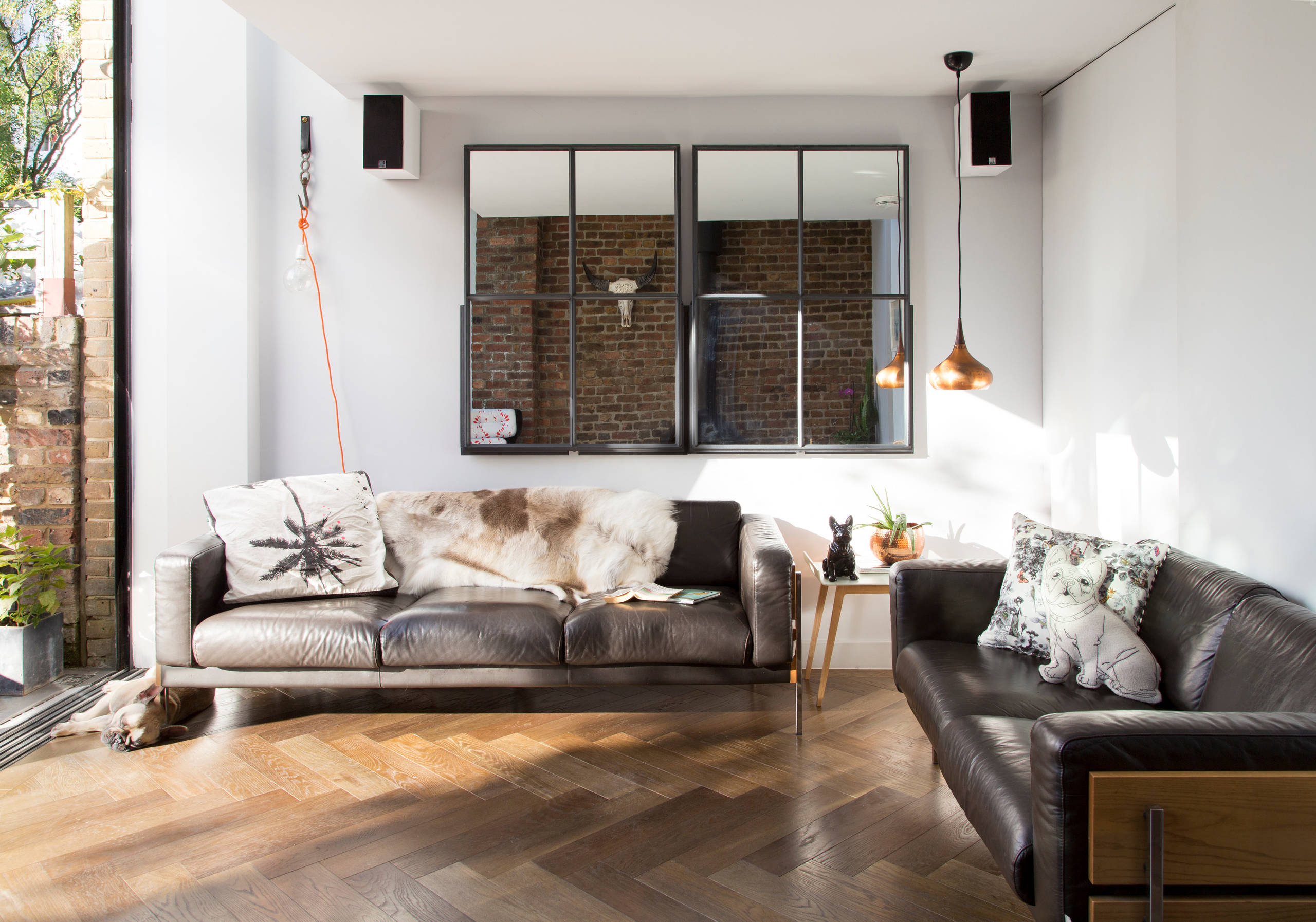 Mel replaced the floorboards all over the house with engineered oak boards, but in the seating area she went for a more interesting parquet. Beneath the fire is a simple, flat hearth, laid with tiles of differing textures.