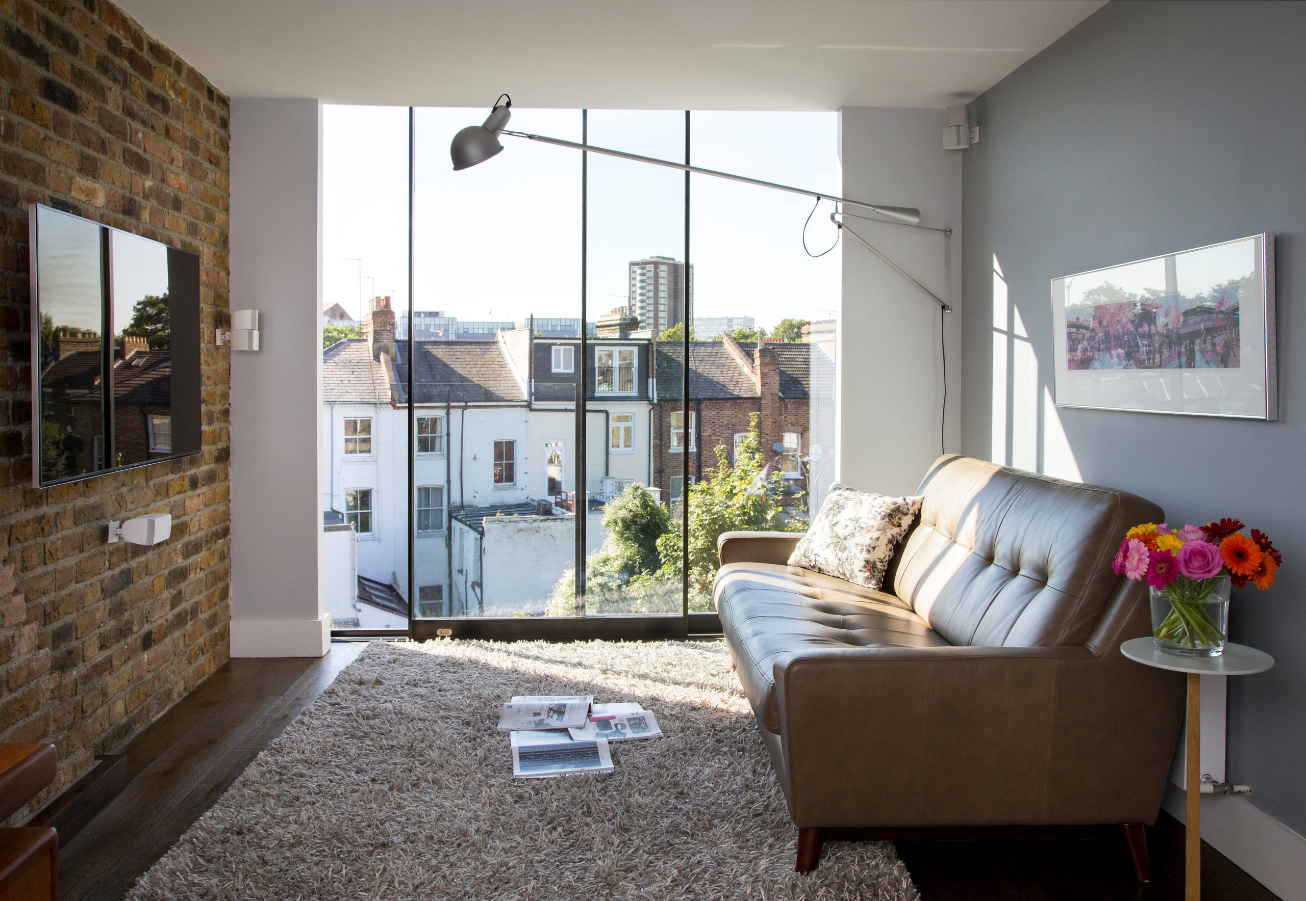 The previous extensions were positioned slightly too low for the new addition, but it would have been tricky to raise them, so instead, the couple incorporated a boxed-in section above the ground-floor seating area (seen here on the left) to accommodate the base of the bathroom above.