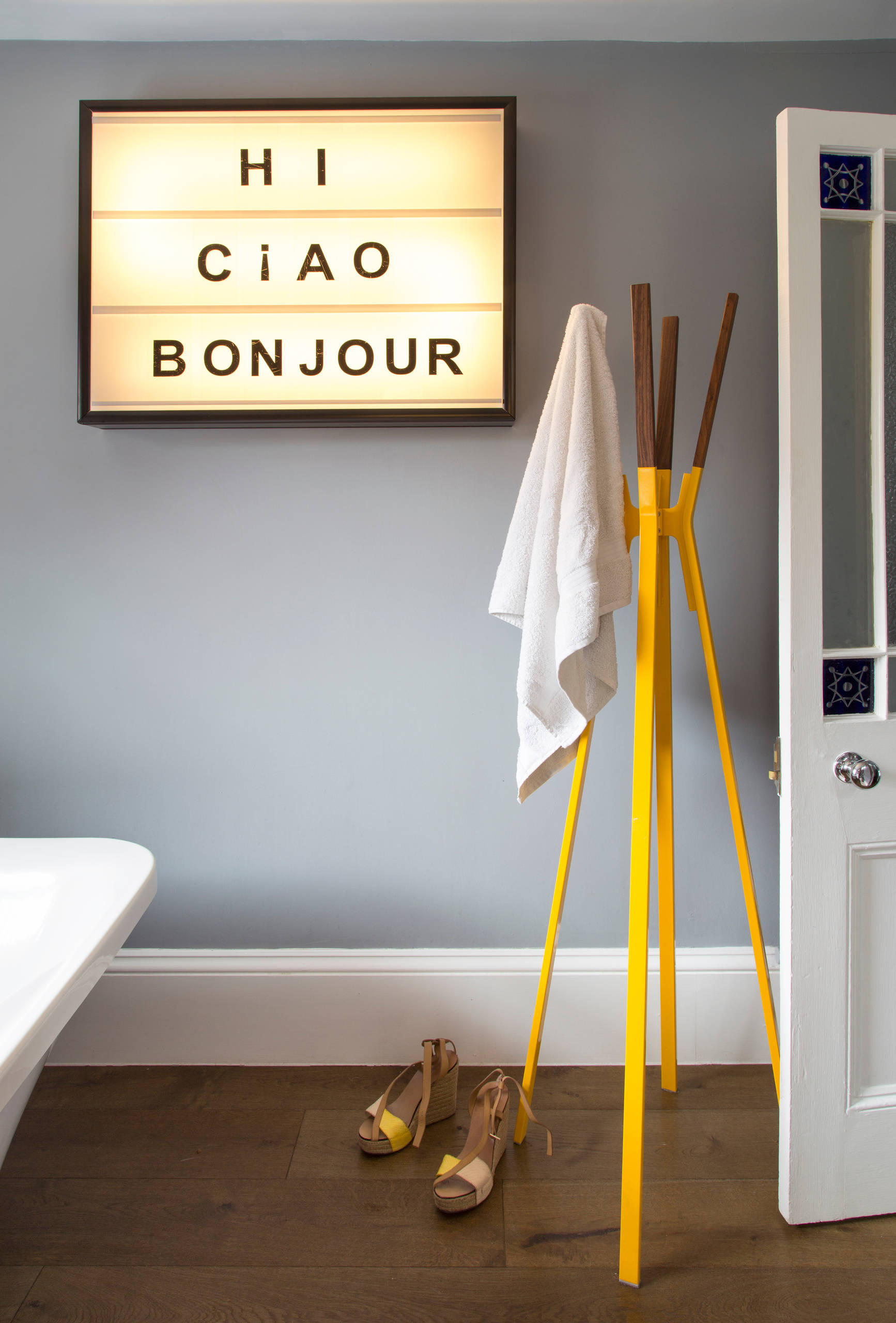 Mel found an interesting coat stand to use as a towel rail and painted the legs of the vanity unit (seen in the previous picture) the same yellow.