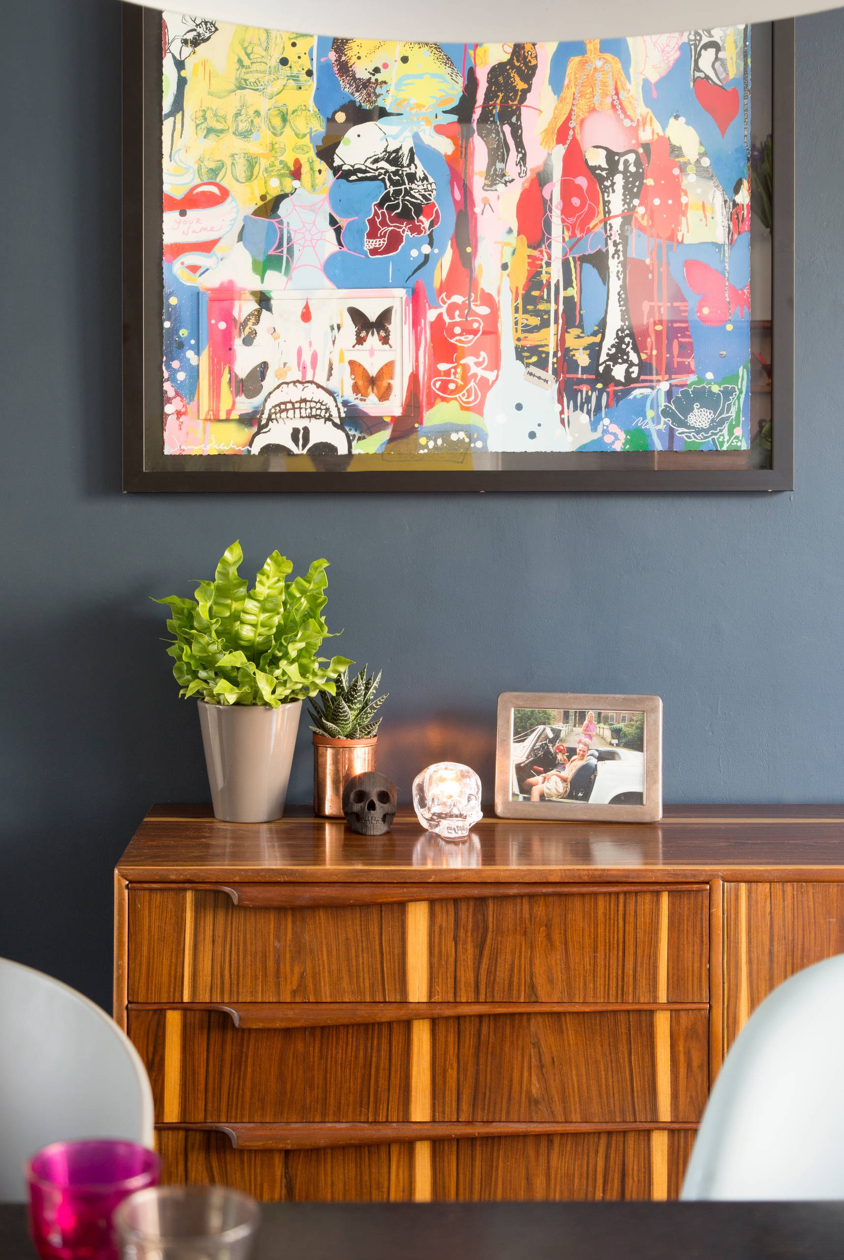 A bright piece of artwork hangs above the sideboard, bringing colourful character to the room.