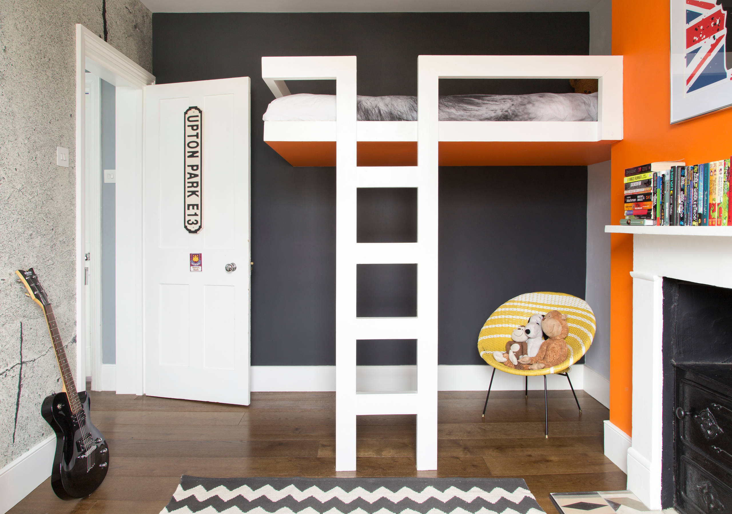 Mel’s builder created this bespoke bed for her eldest son’s room. The white frame and ladder contrast with the dark wall behind and orange surfaces elsewhere.