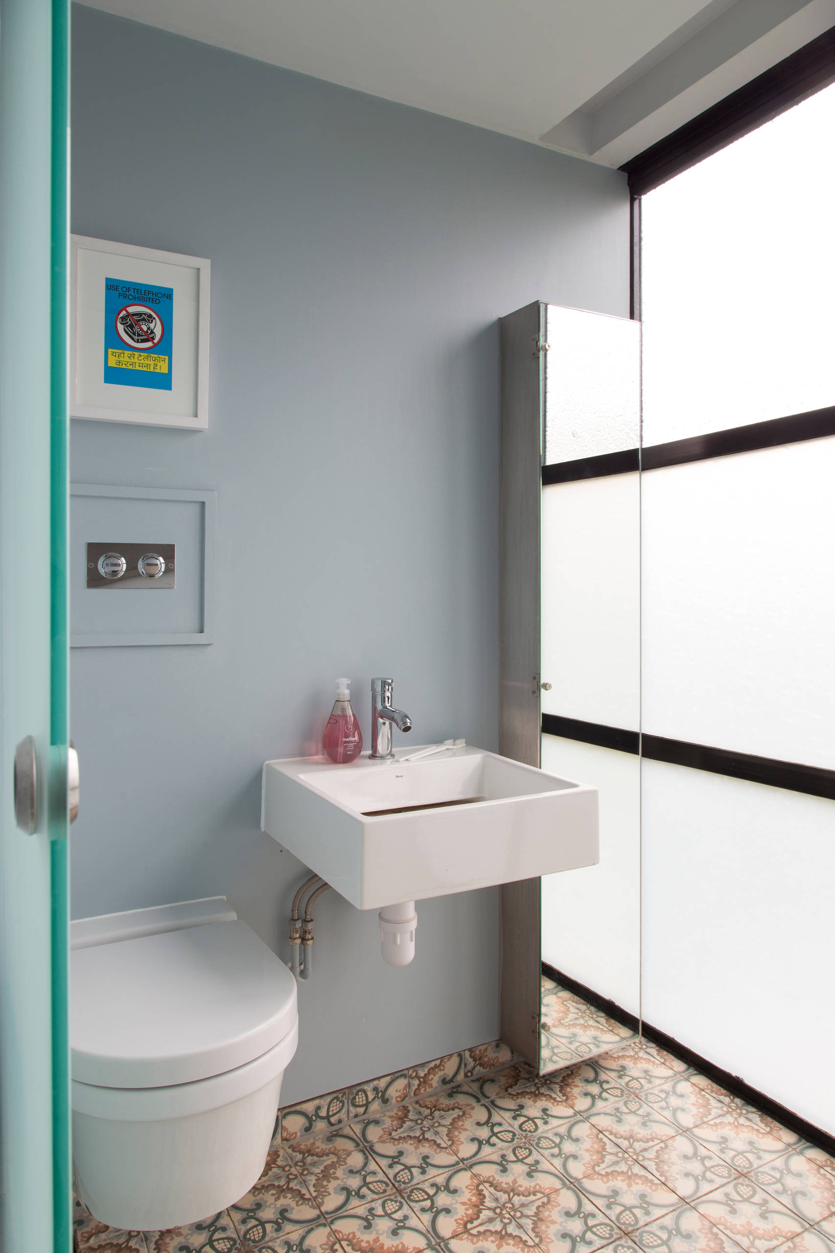 The steel-framed windows are made from toughened glass, with opaque panels below and a top row of transparent glazing. “The room isn’t overlooked and it’s lovely to gaze out from the shower,” Mel says.