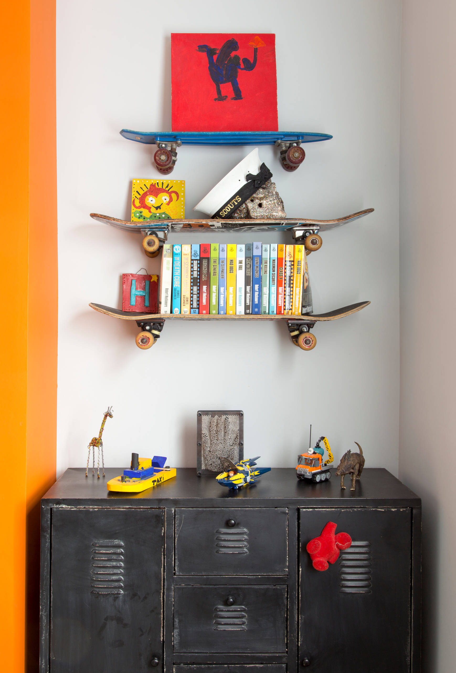 The couple’s son is a keen skateboarder, so Mel created some fun skateboard shelves for his books and knick-knacks.