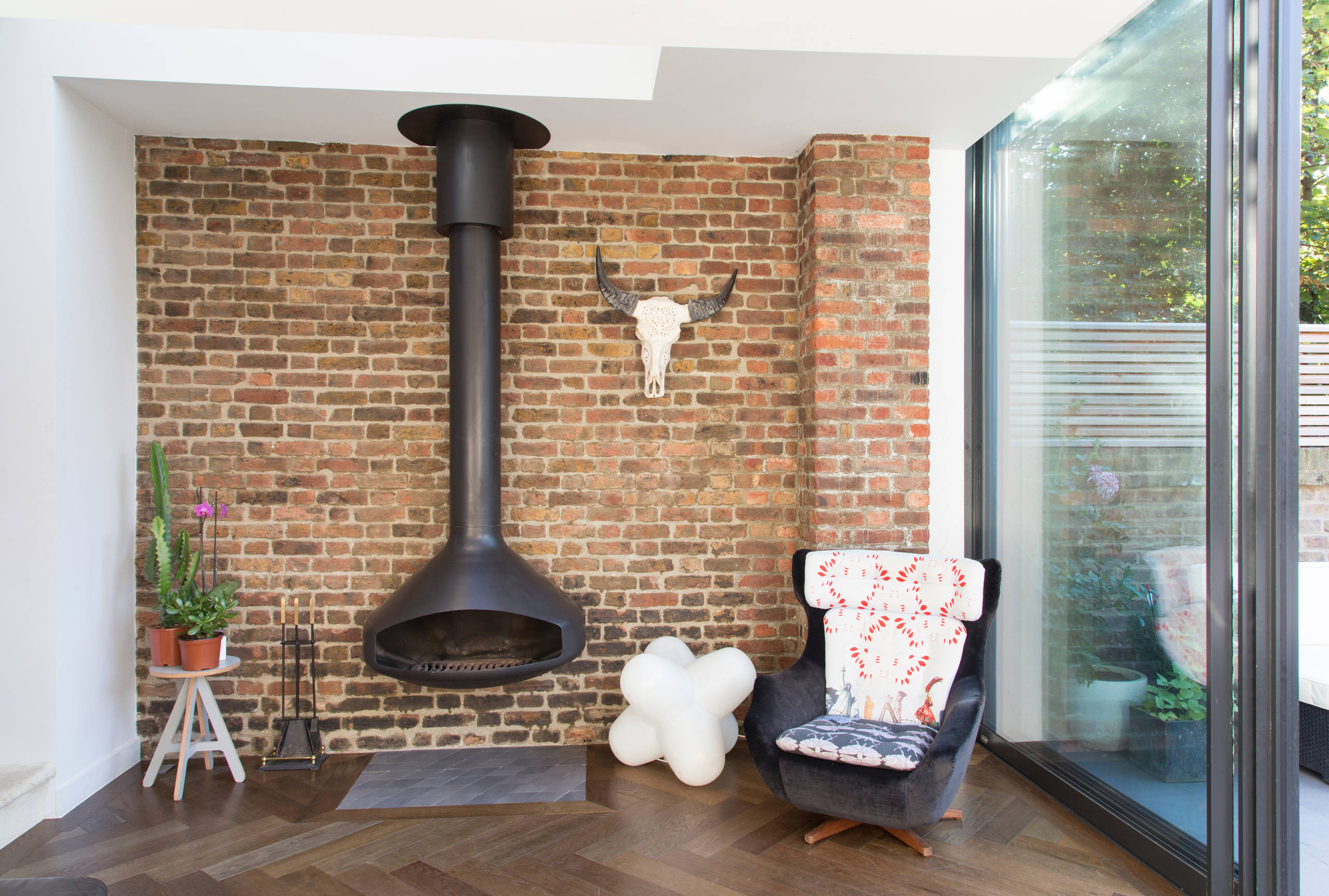 At the opposite end of the extension is a wall-hung fireplace, which gives a cosy feel to the space. “This was tricky to get right, as we didn’t want the flue to cover the rooflight above,” Mel says. “It was solved by creating a dog leg that comes out to the right.”