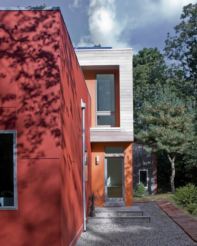 "The vibrant red and orange façade colors were inspired by the site’s autumnal color palette, while the Cape Cod location influenced the selection of shiplapped cedar siding."