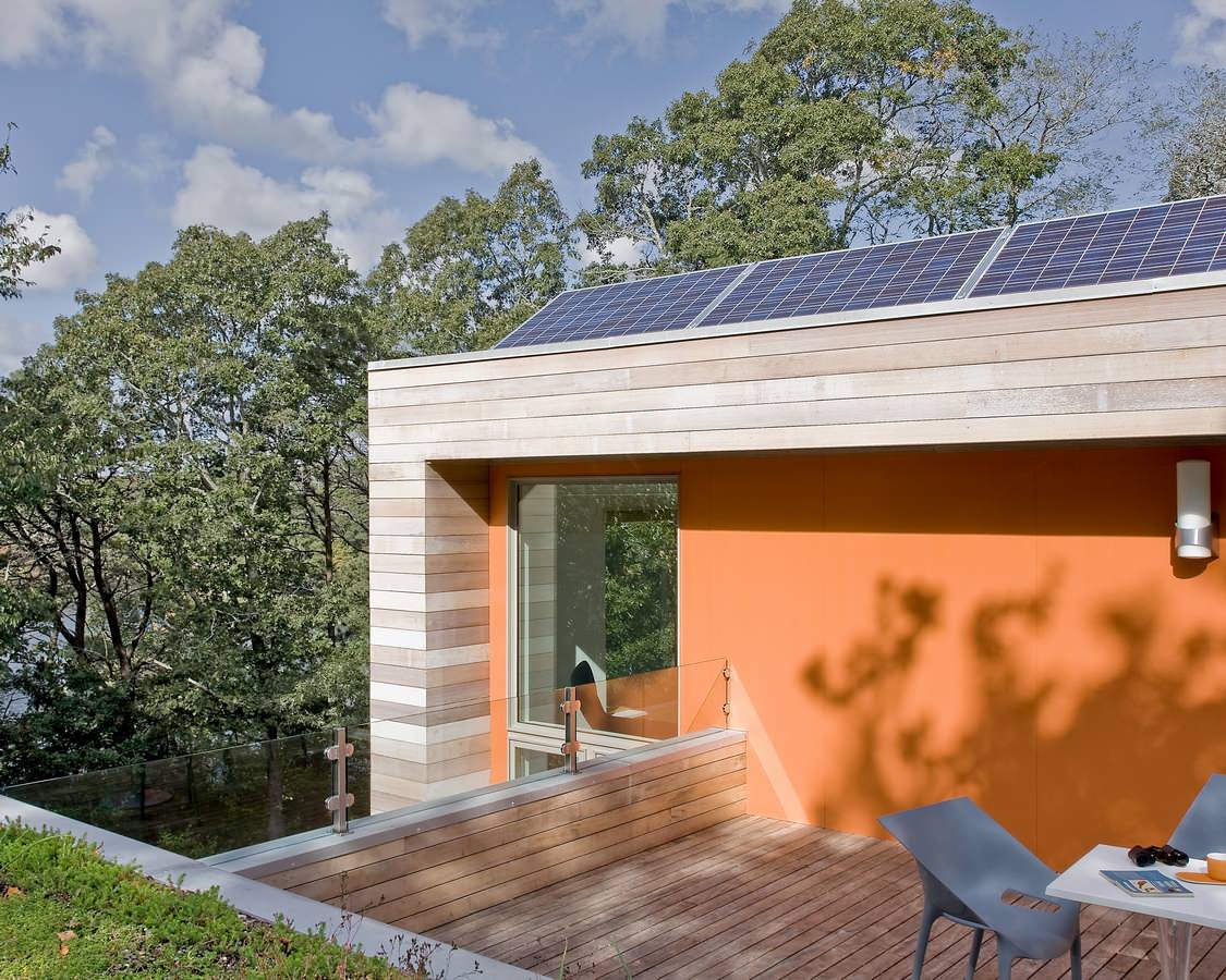 Here is another angle of what's just beyond the living roof (you see a bit of it in the bottom left corner). This second story deck has a tree house feel. Beyond that, Stephanie tells us, "The home’s roofdeck provides views of Pilgrim Lake and the surrounding tree canopy. Though the house sits only 125 feet from the lake, several trees provide privacy to the site. In winter, once the trees have shed their leaves, the view really opens up from both the second floor master suite and the roof deck." In a time when some homeowners associations are barring solar panels as unsightly, this home shows how they can be an attractive addition that can save lots of energy and money.