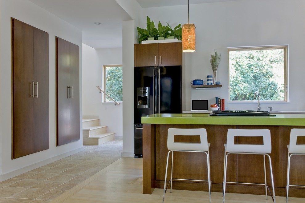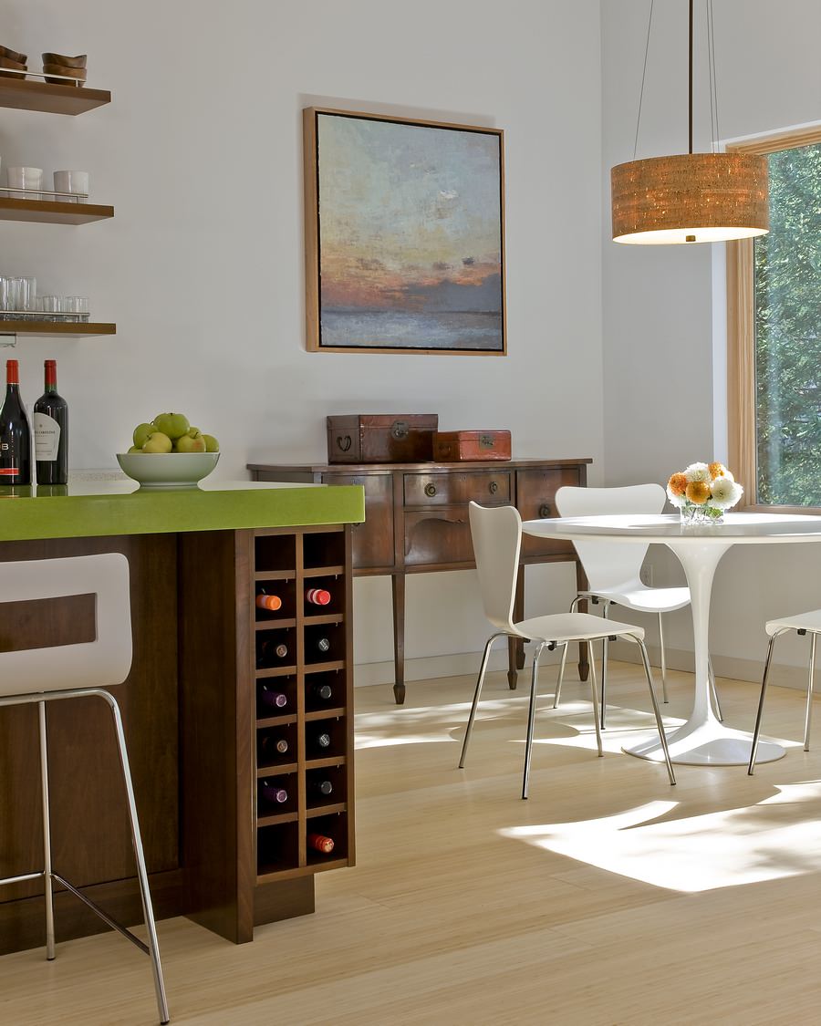 "The low-VOC stain on the cabinets was selected to match an antique family heirloom." The lower cabinets were custom designed by ZED.