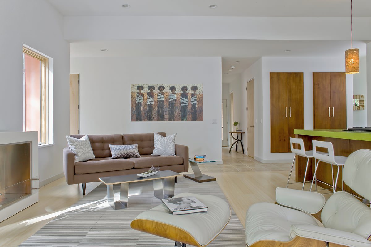 The wide open kitchen and living spaces are the heart of the home. The firebox is by EcoSmart Fire