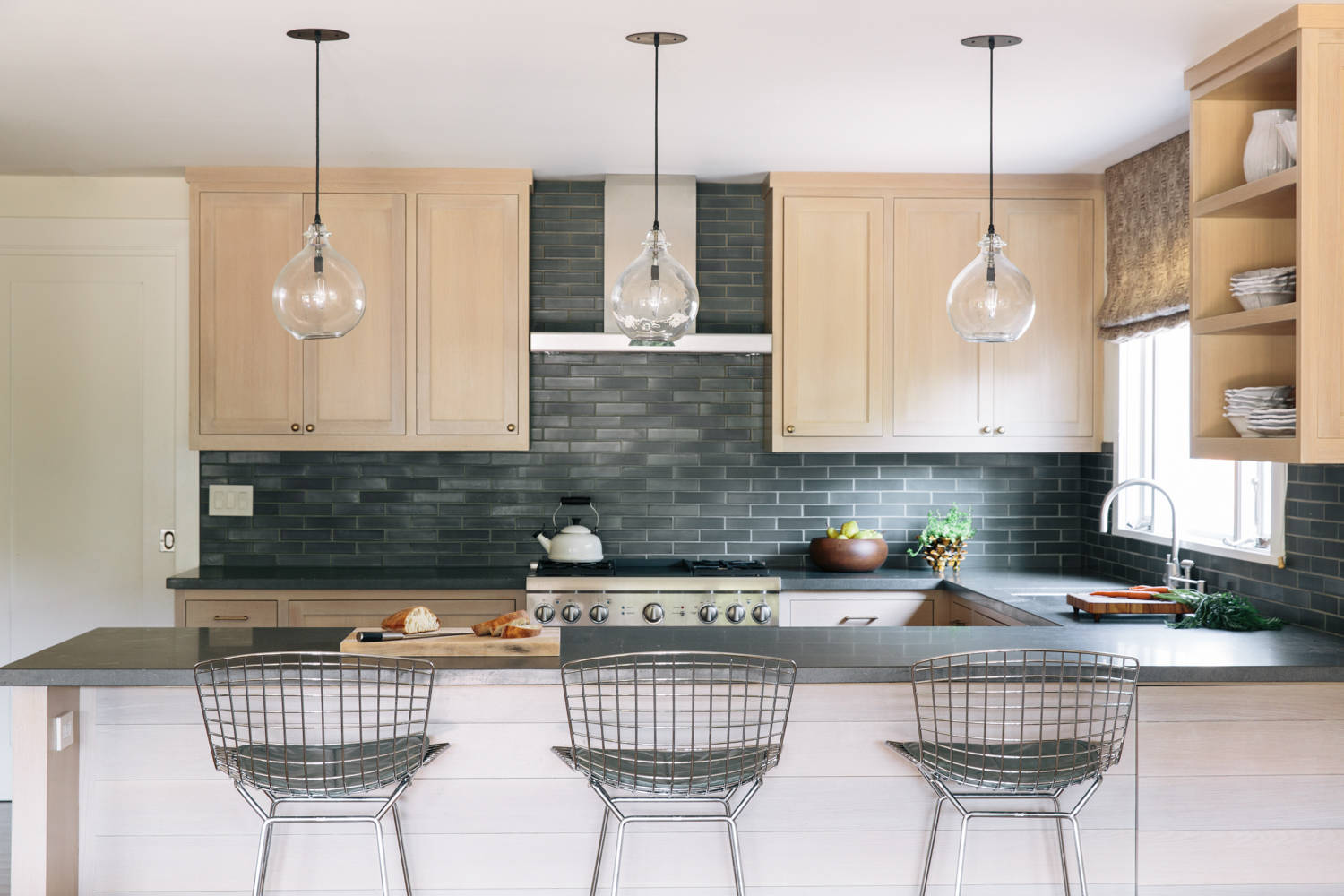 Backsplash: Heath; counter stools: Bertoia; pendant lights: Cisco Home