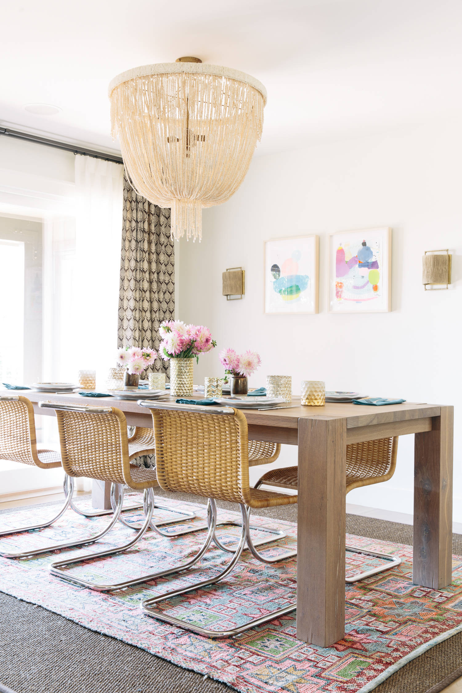 “I didn’t want the dining room to feel too stuffy,” Moran says. “We’re not hosting too many formal dinners — it’s mainly a space we use together as a family.” In the dining room and throughout most of the house, the color comes from the art and accessories. This room features a festively hued Turkish rug atop a sisal one to create a cozy layered effect. The dining chairs are a vintage design in wicker and chrome. The chandelier is made of puka shells strung together; when lit at night, the shells create an iridescent glow.