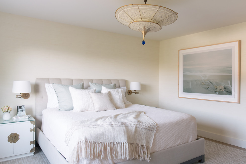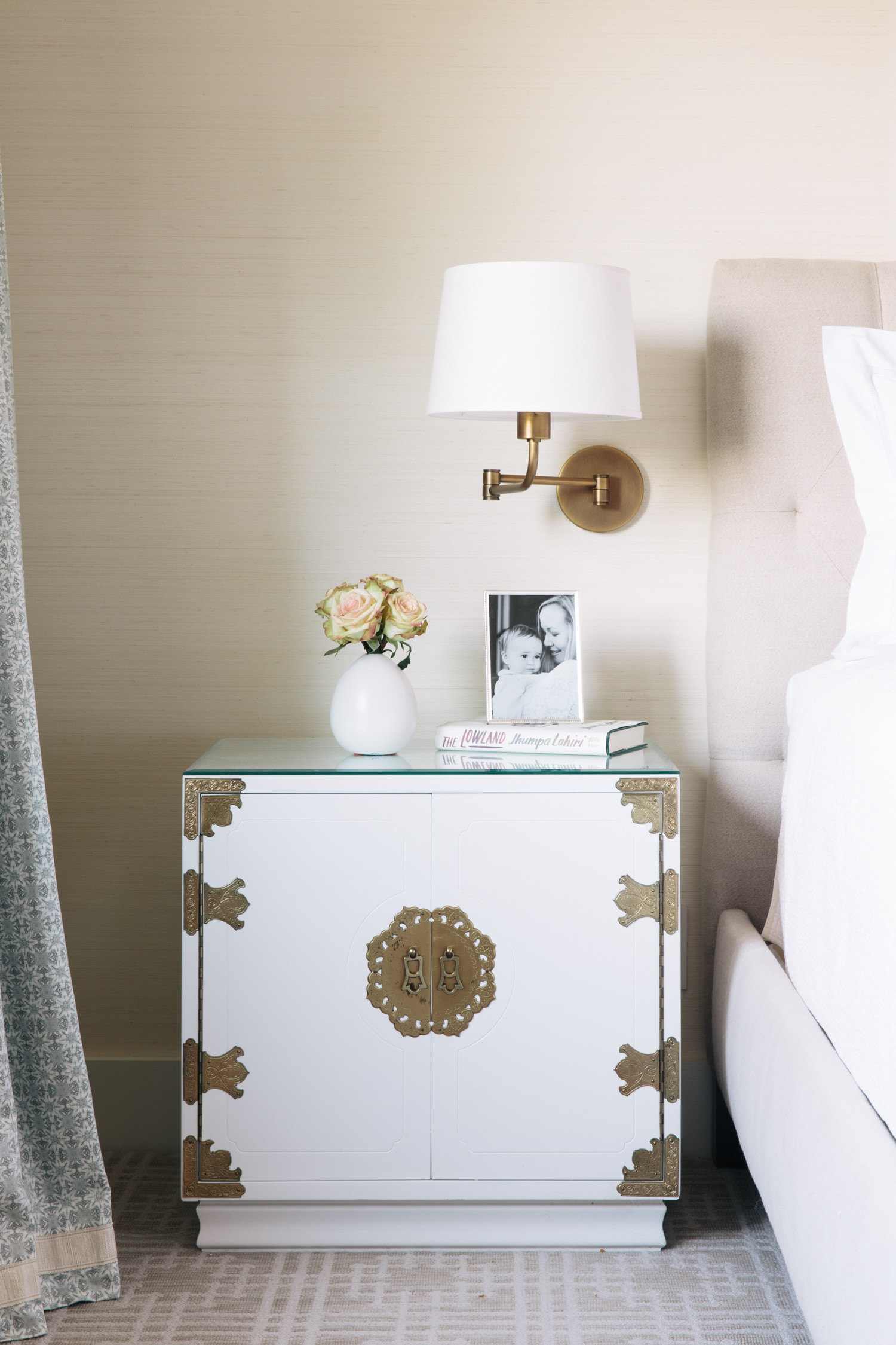 Moran added a glass top to the vintage white lacquered cabinet to create a nightstand. Other highlights of the room include the swing-arm sconces from Robert Abbey; the bed upholstered in natural linen; and the sheen-filled curtains, fabricated by Susan Lind Chastain.