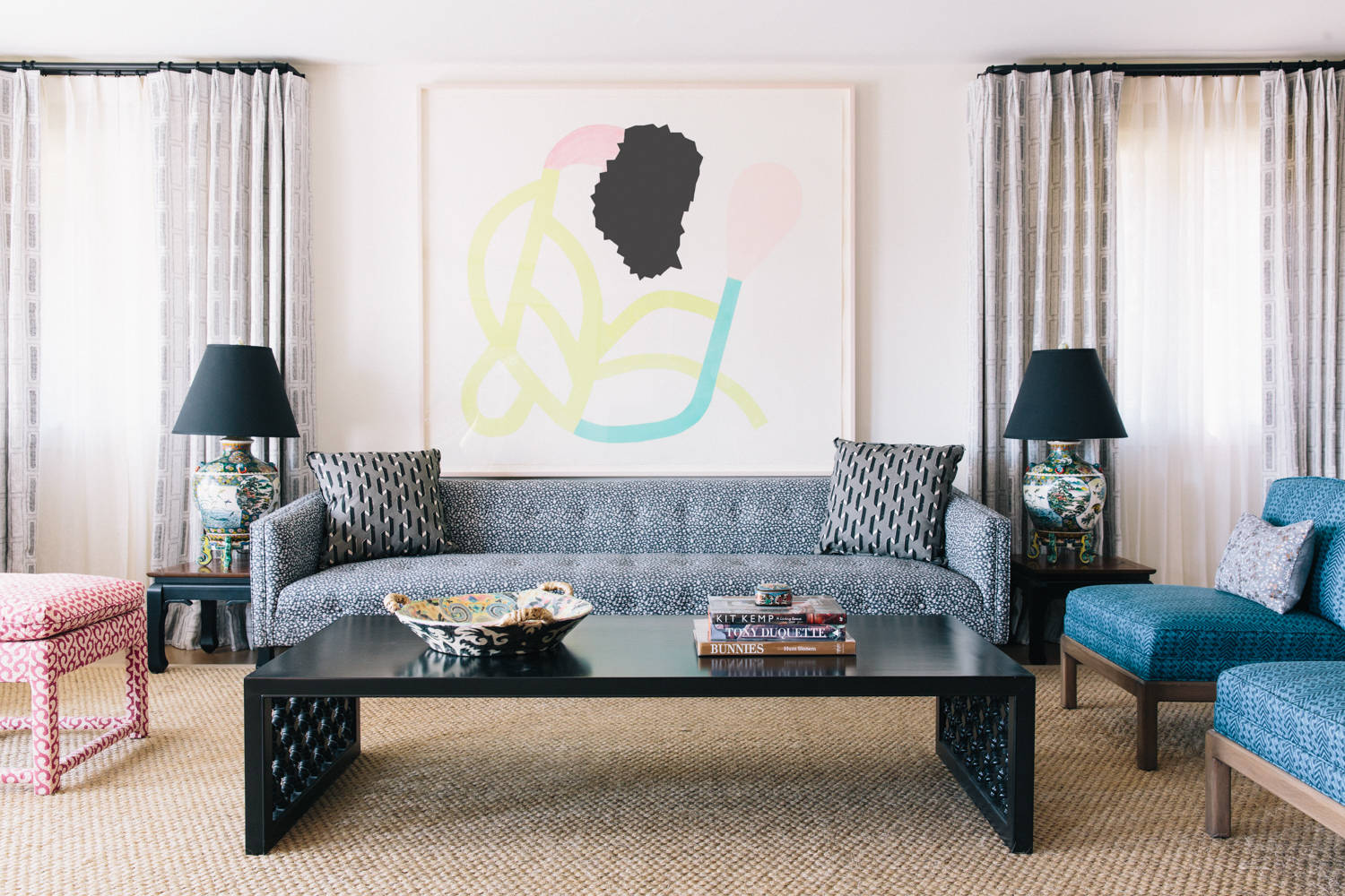 Sofa: vintage, covered in Casamance fabric; art: Jaime Angelopoulos; blue chairs: vintage, covered in Luxor fabric by Lisa Fine; ottoman: vintage, covered in Seema Krish fabric; drapes: fabric by Martyn Lawrence Bullard, fabricated by Susan Lind Chastain; rug: Stark