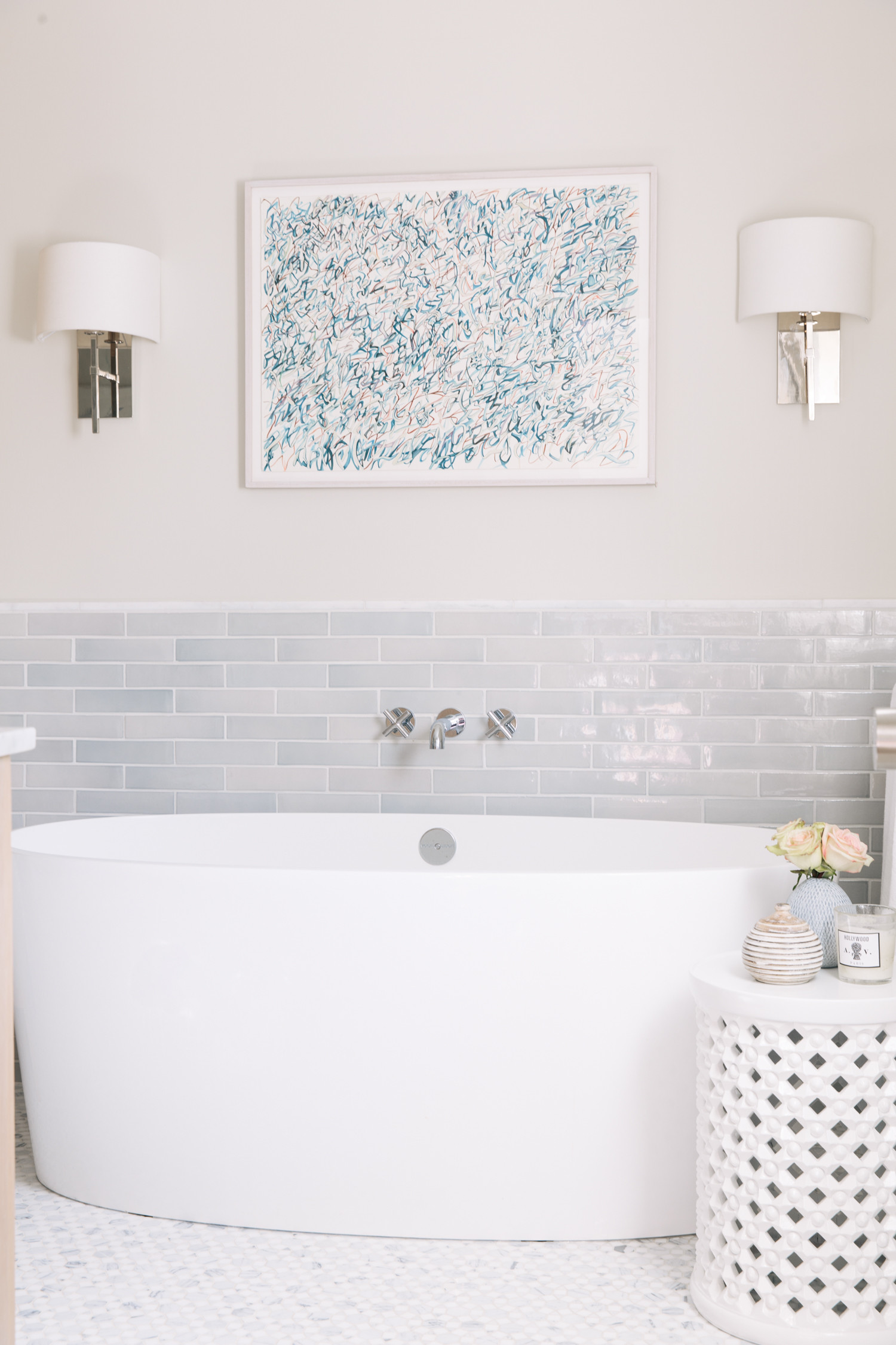 The free-standing tub sits atop a slightly iridescent mosaic tile floor. A Turkish ceramic garden stool provides a place for flowers and candles. An abstract painting by San Francisco artist Megan Olson hangs above the tub.