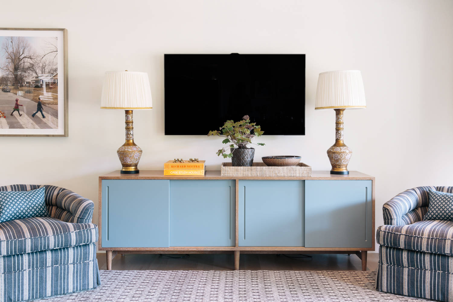 Rug: Stark; media cabinet: custom, designed by Caitlin Moran Interiors