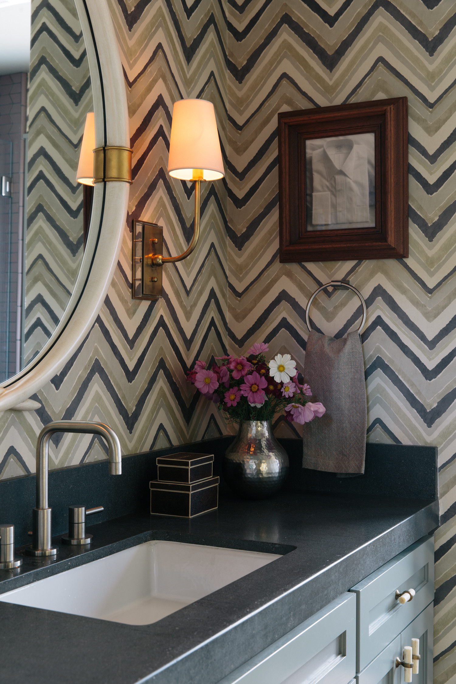 The powder room’s zigzag wallpaper, faux bone mirror and cabinet hardware, and framed photo of a folded white shirt create a jewel box of a space with a masculine undertone. “There’s a tendency to make powder rooms super frilly, but I was going for understated elegance,” Moran says.